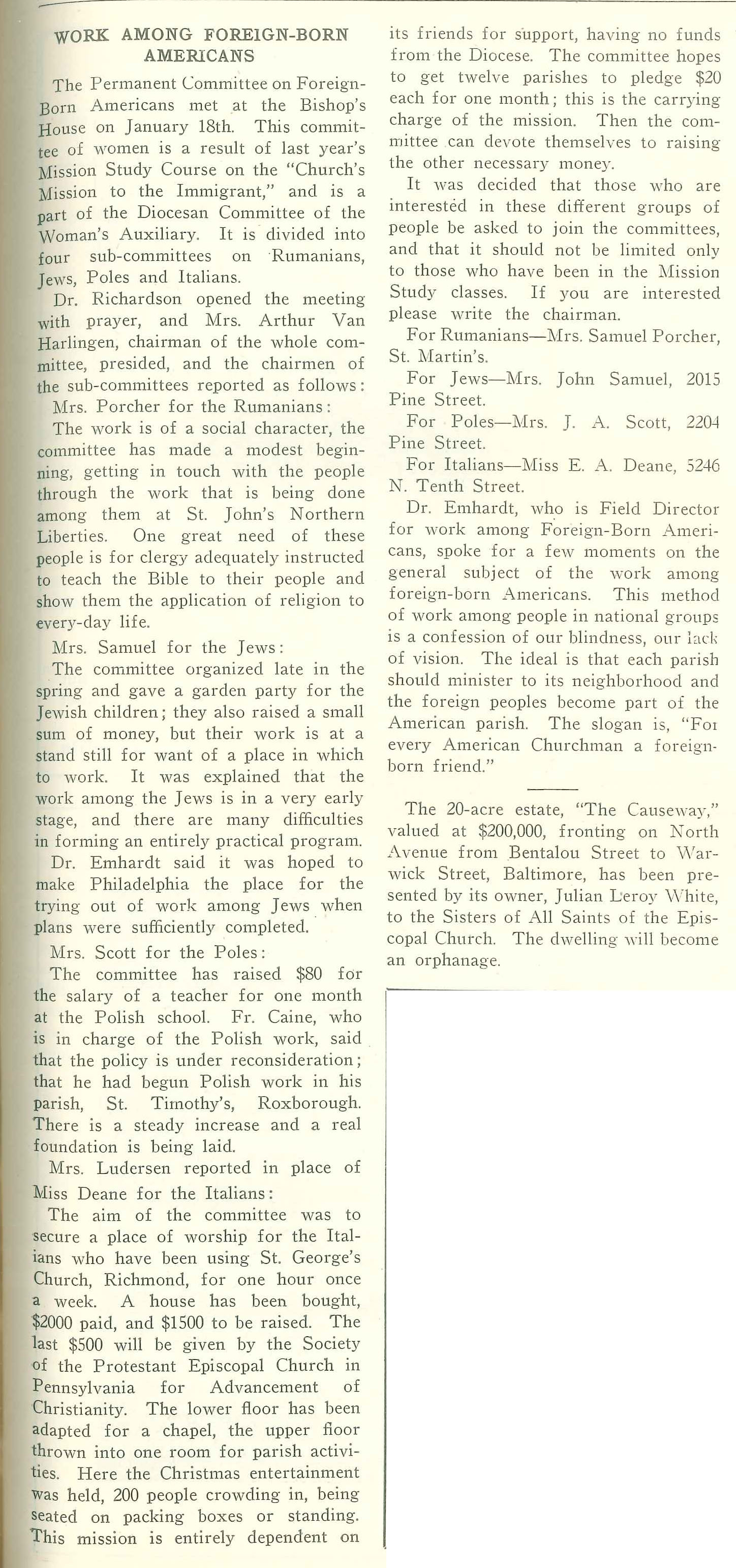 Report on the Work Among Romanians, Jews, Poles, and Italians in the Diocese of Pennsylvania (1921)