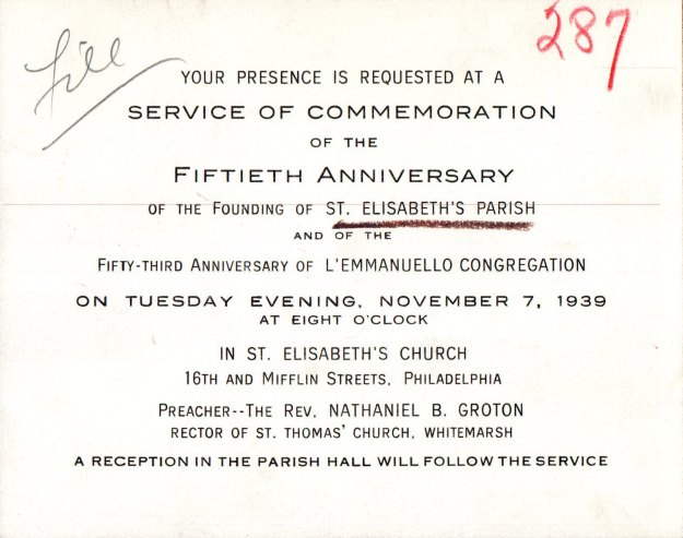 Invitation to the Service of Commemoration of the Fiftieth Anniversary of the Founding of St. Elisabeth’s Church and the Fifty-Third Anniversary of L’Emmanuello (1939)