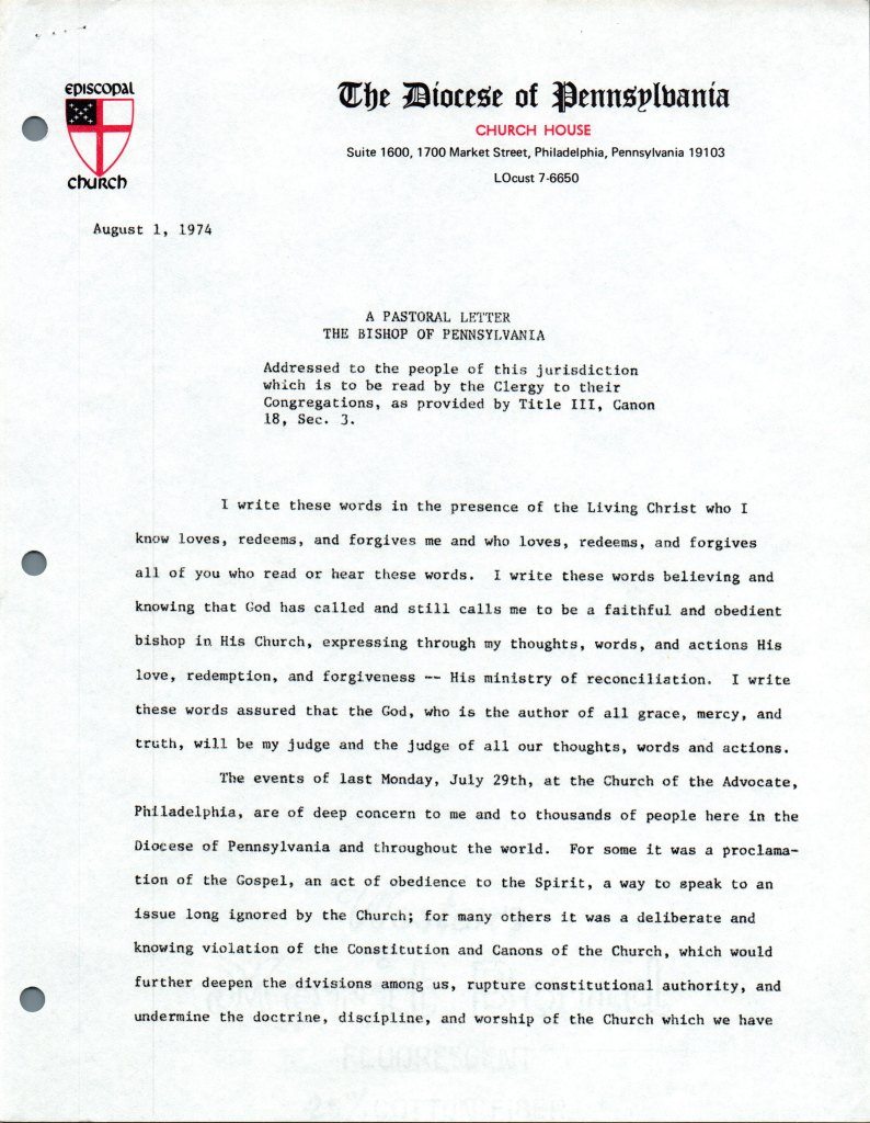Letter from the Rt. Rev. Lyman C. Ogilby Regarding the Ordination of Women at the George W. South Memorial Church of the Advocate, Philadelphia (1974)