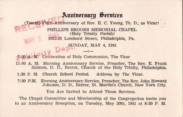 Notice of the Twenty-Fifth Anniversary of Rev. E. C. Young as Vicar of Phillips Brooks Memorial Chapel (1941)