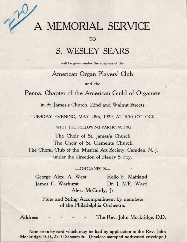 Notice of the Memorial Service to S. Wesley Sears at St. James’s Church, Philadelphia (1929)