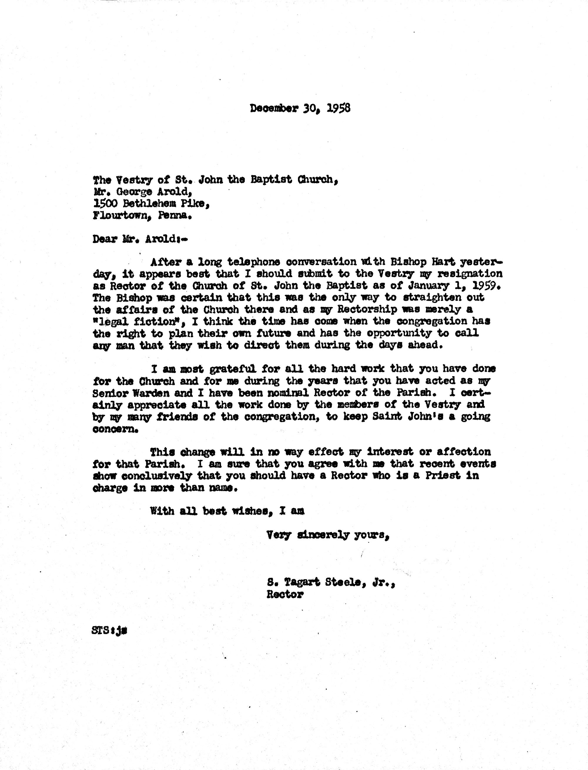 Letter of Resignation of Rev. S. Tagart Steele, Jr. as Rector of Church of St. John the Baptist, Germantown (1958)
