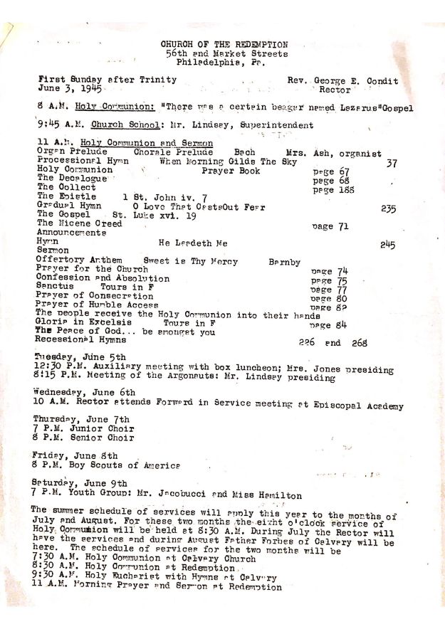 Service Leaflet for First Sunday after Trinity at Church of the Redemption, West Philadelphia (1945)
