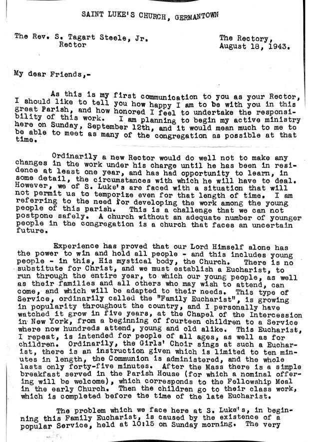 Letter from the Rev. S. Tagart Steele, Jr., regarding the Family Eucharist at St. Luke’s Church, Germantown (1943)