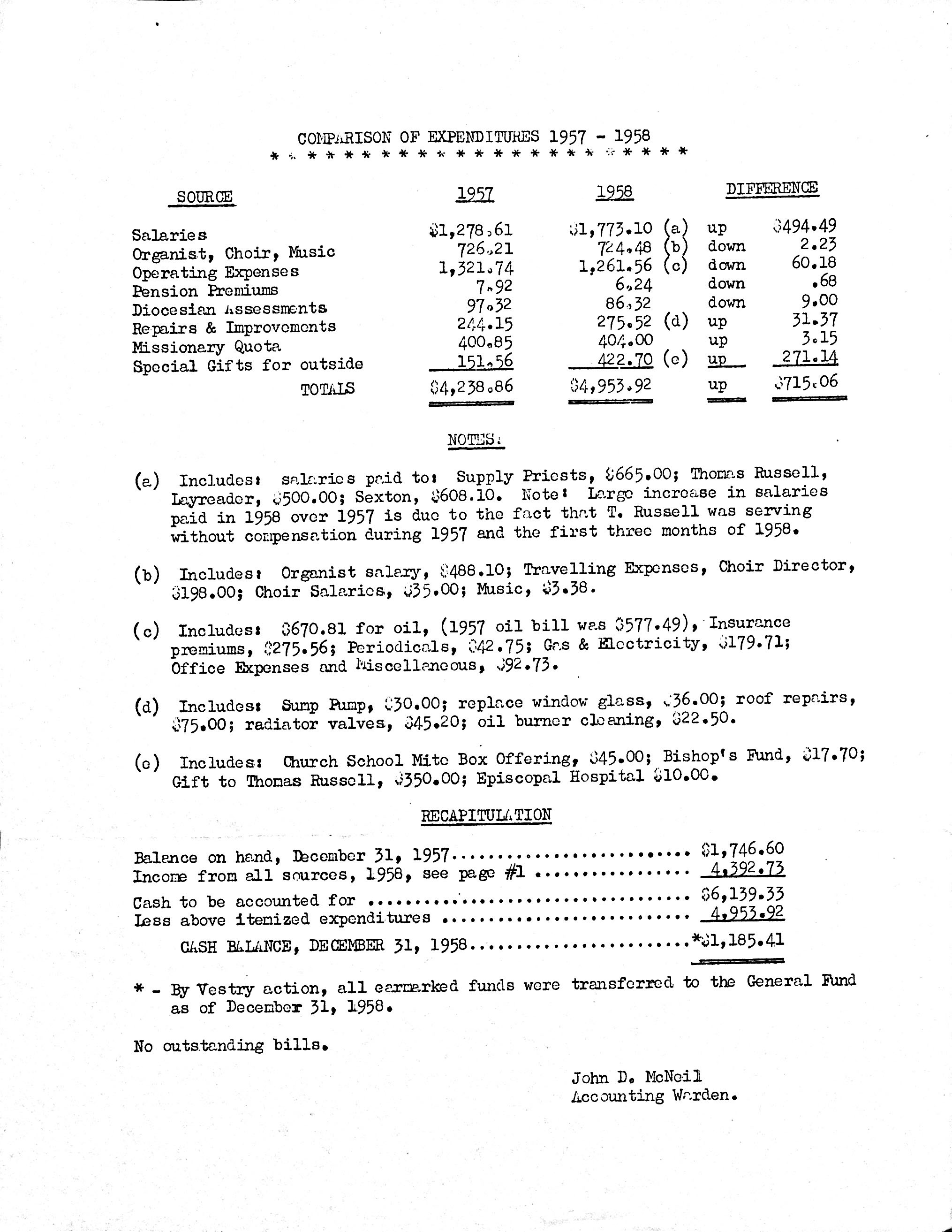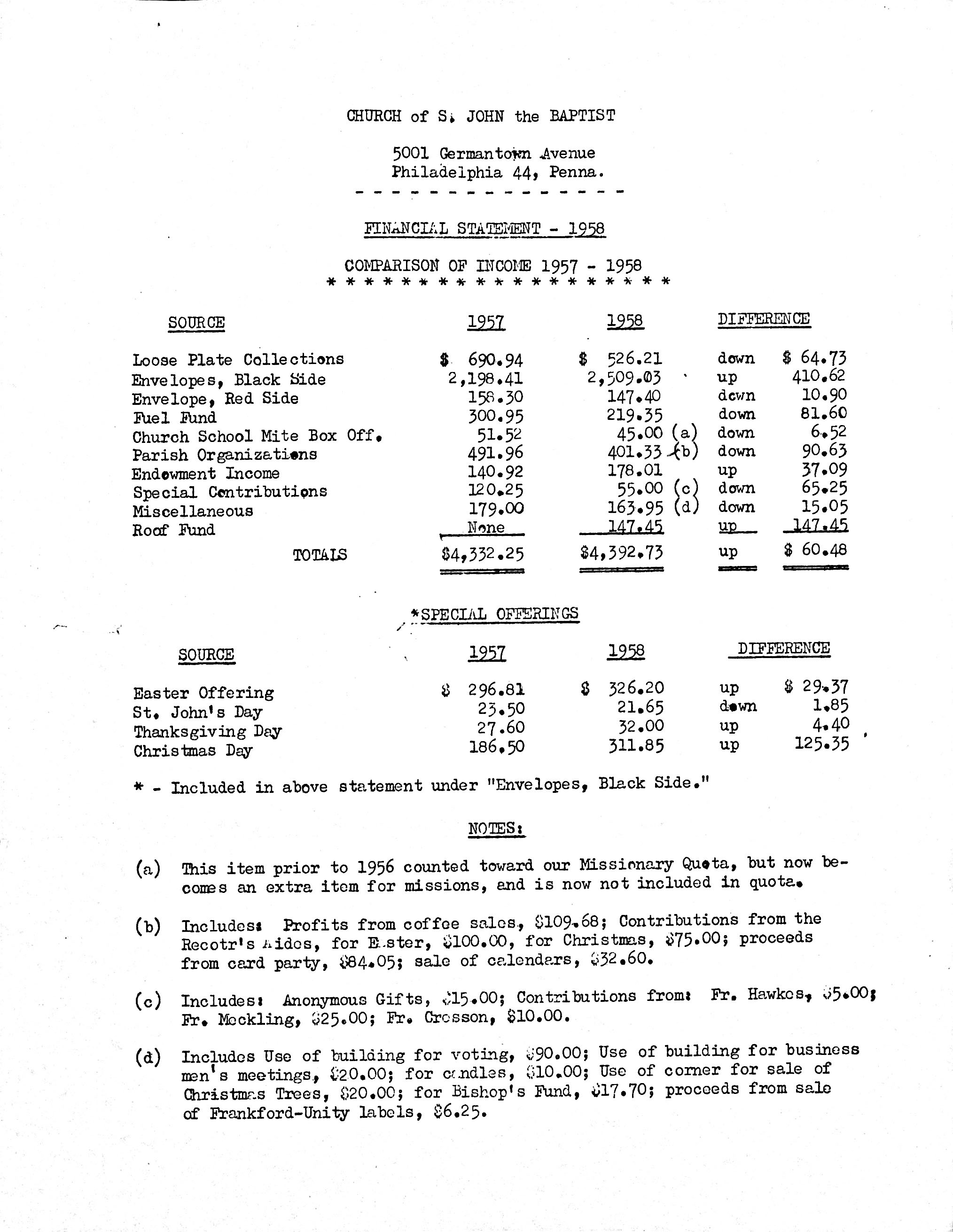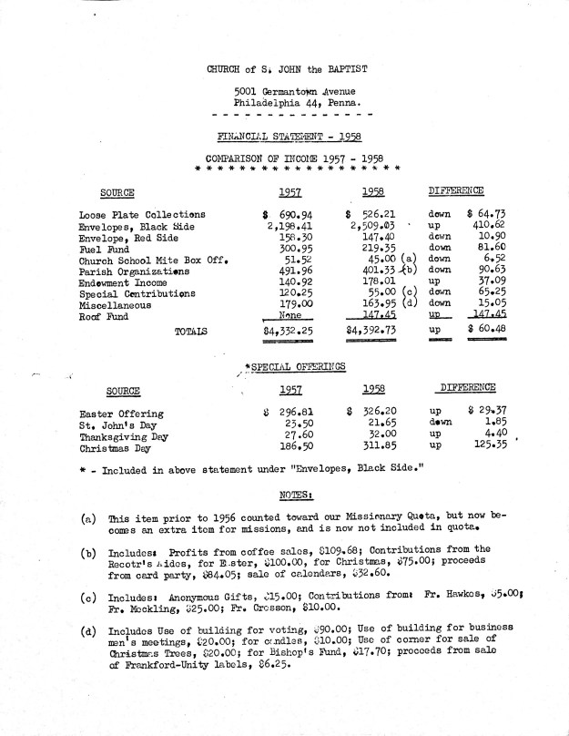 Financial Statement of the Church of St. John the Baptist, Germantown, for 1958