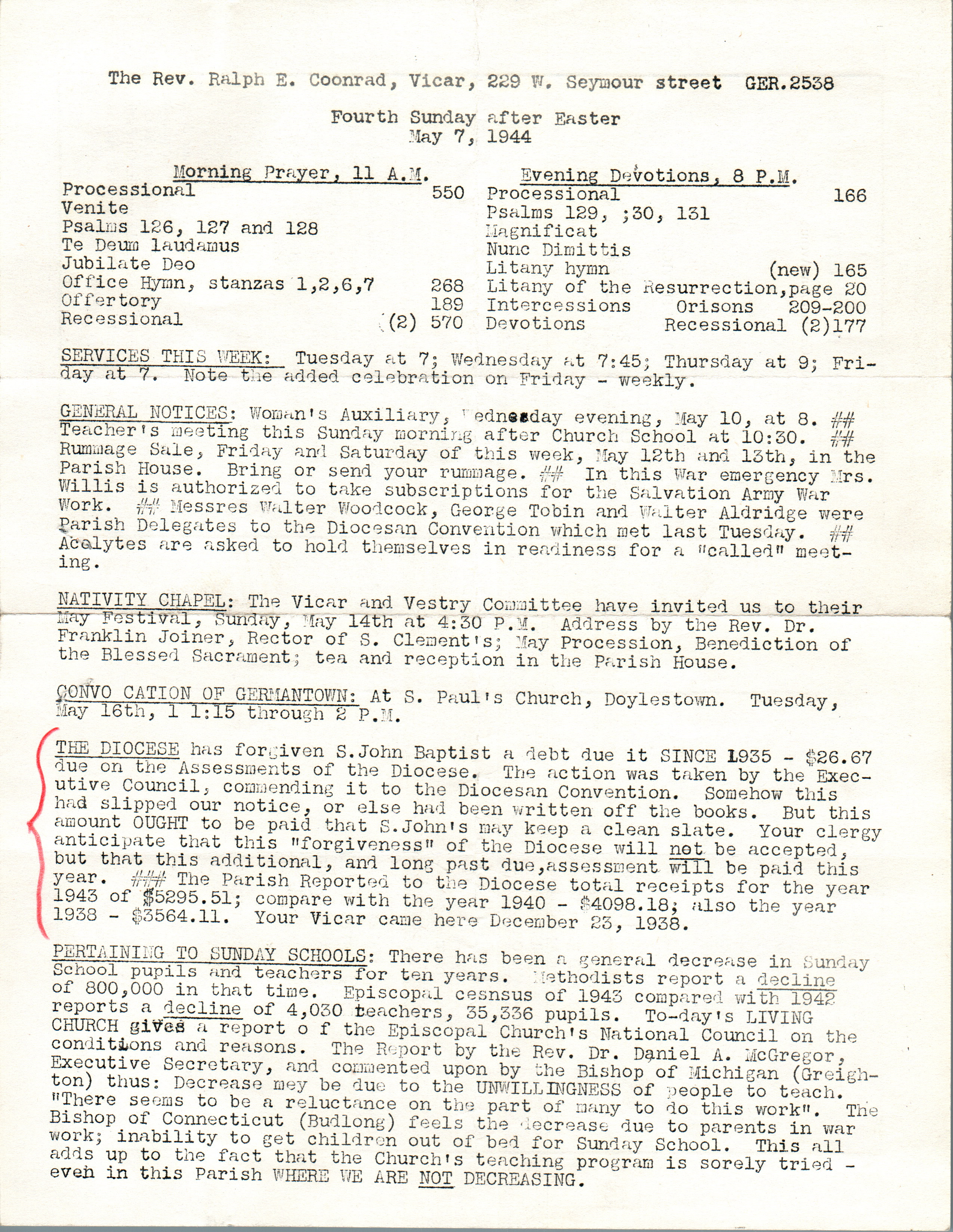 Service Leaflet for the Fourth Sunday after Easter at the Church of St. John the Baptist, Germantown (1944)