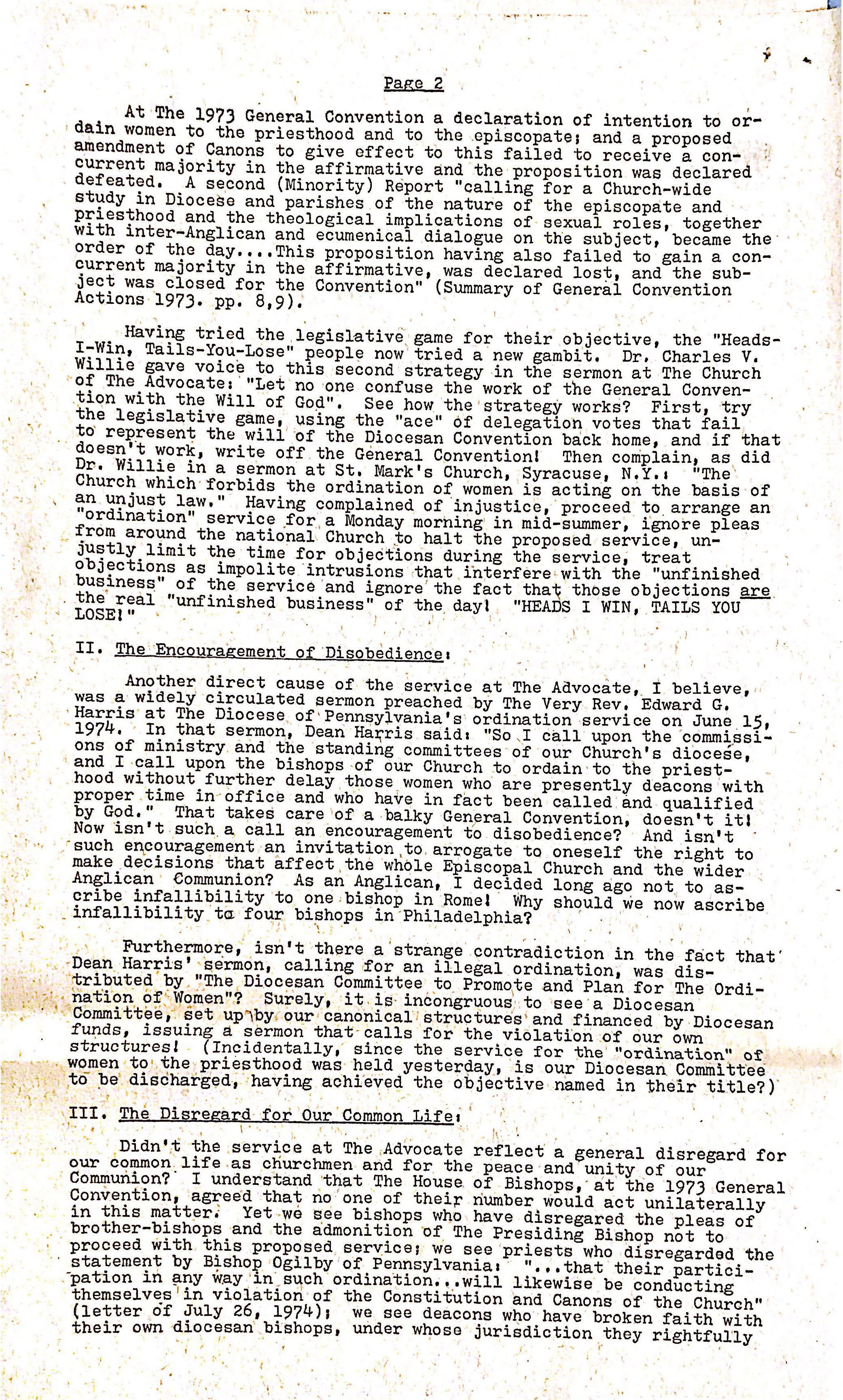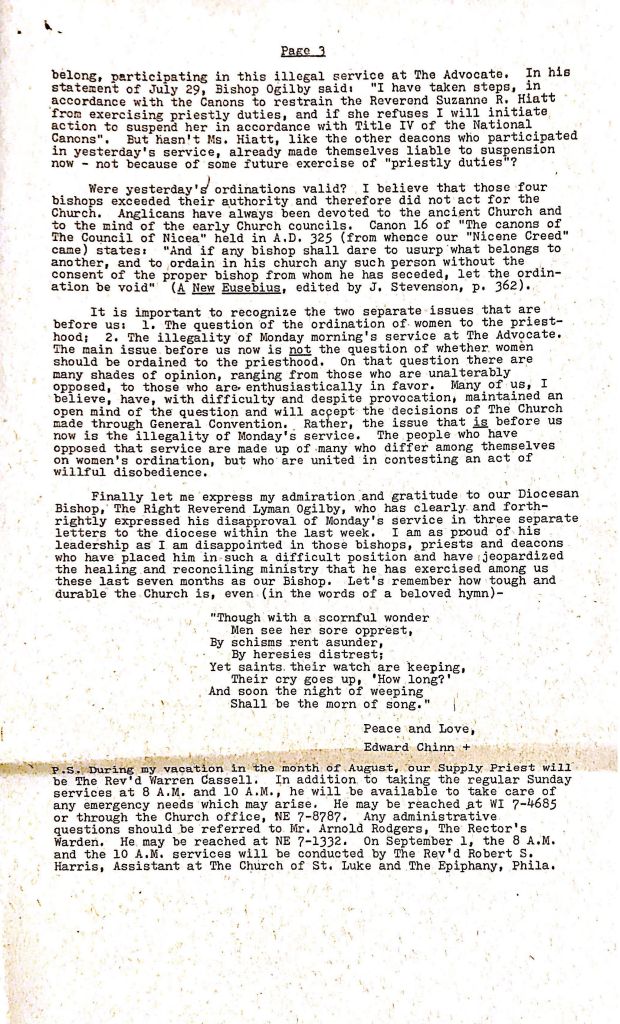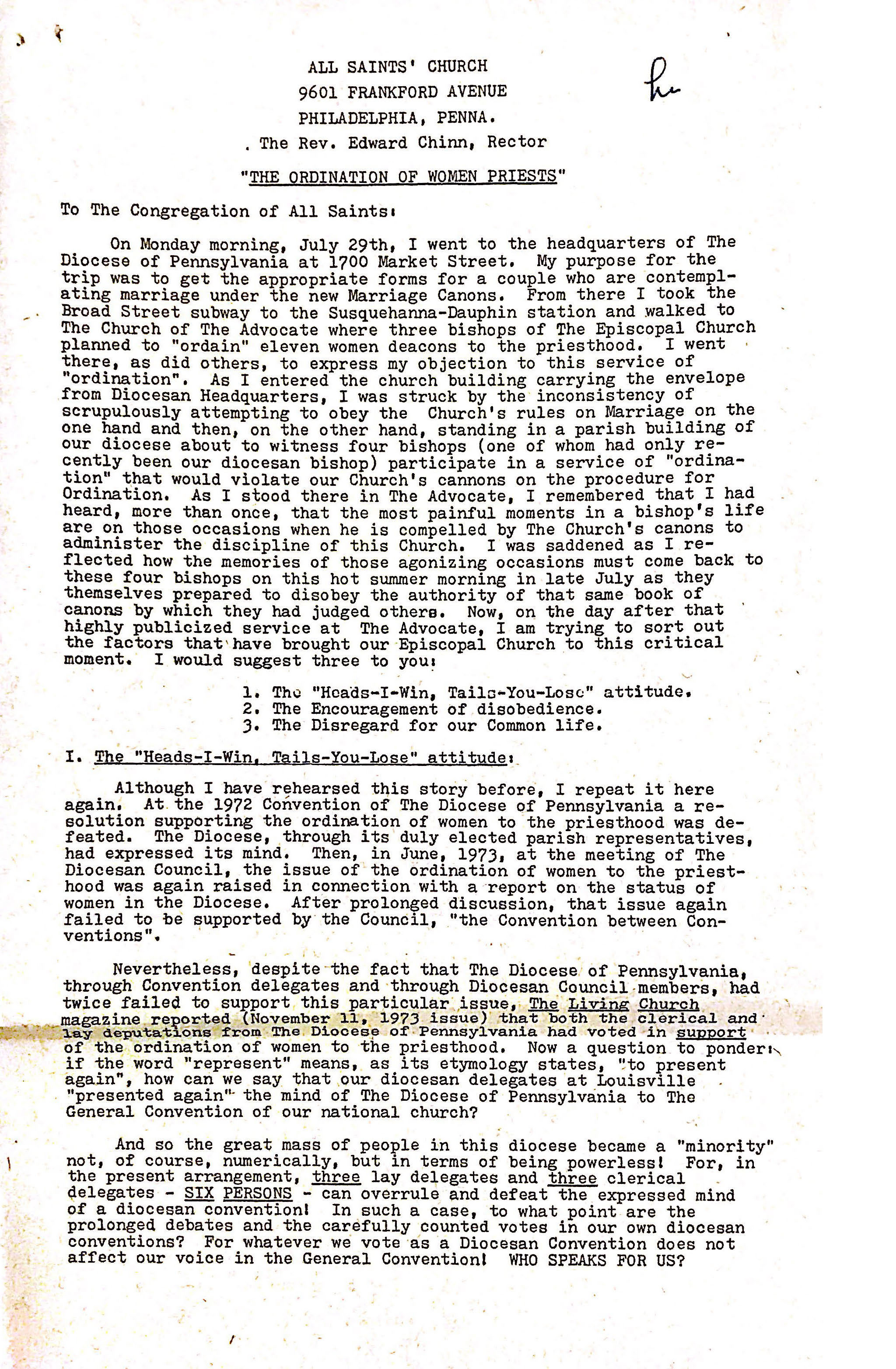 The Ordination of Women Priests: A Letter to the Congregation of All Saints’ Church, Torresdale (1974)