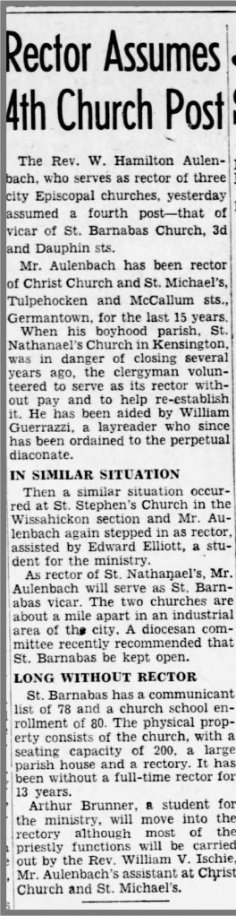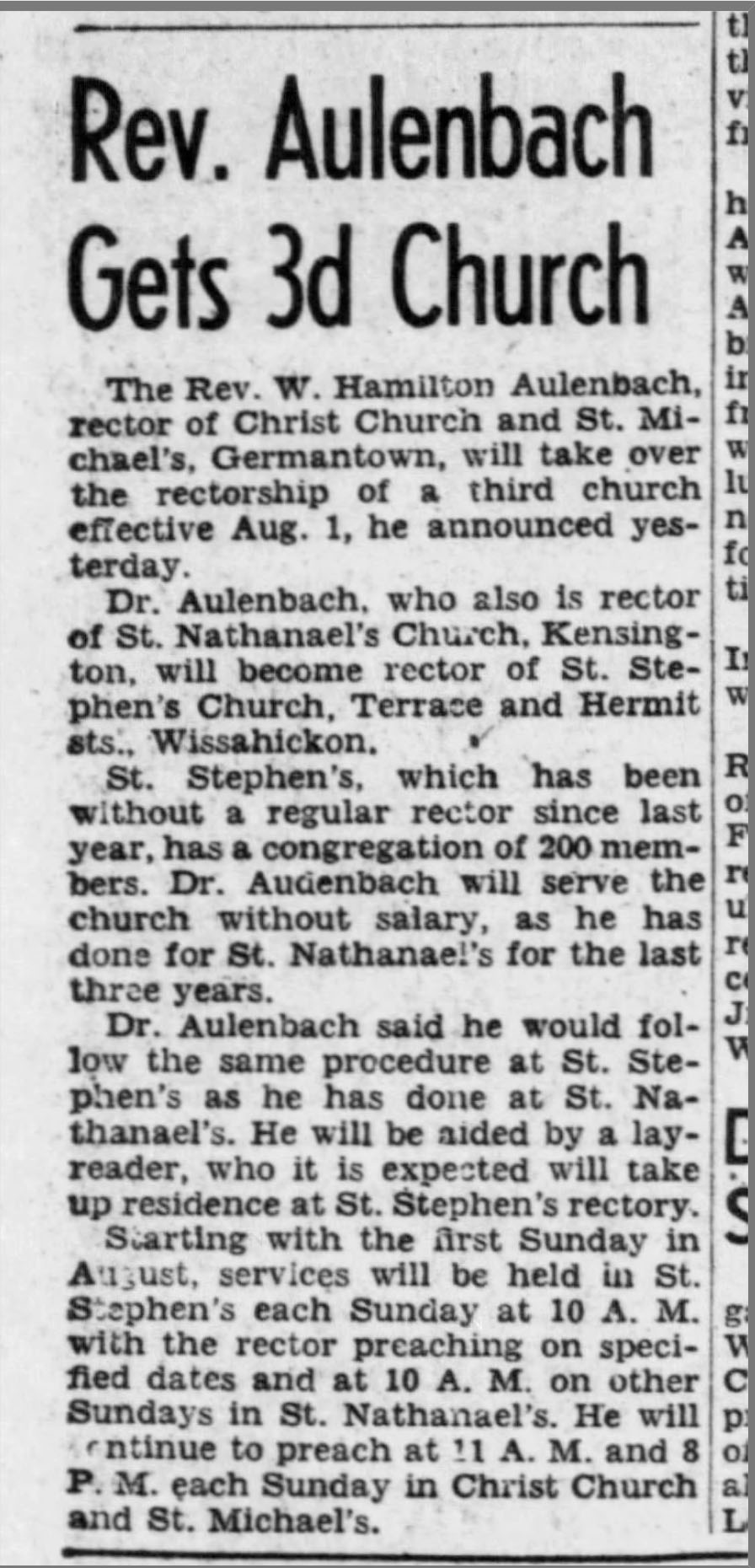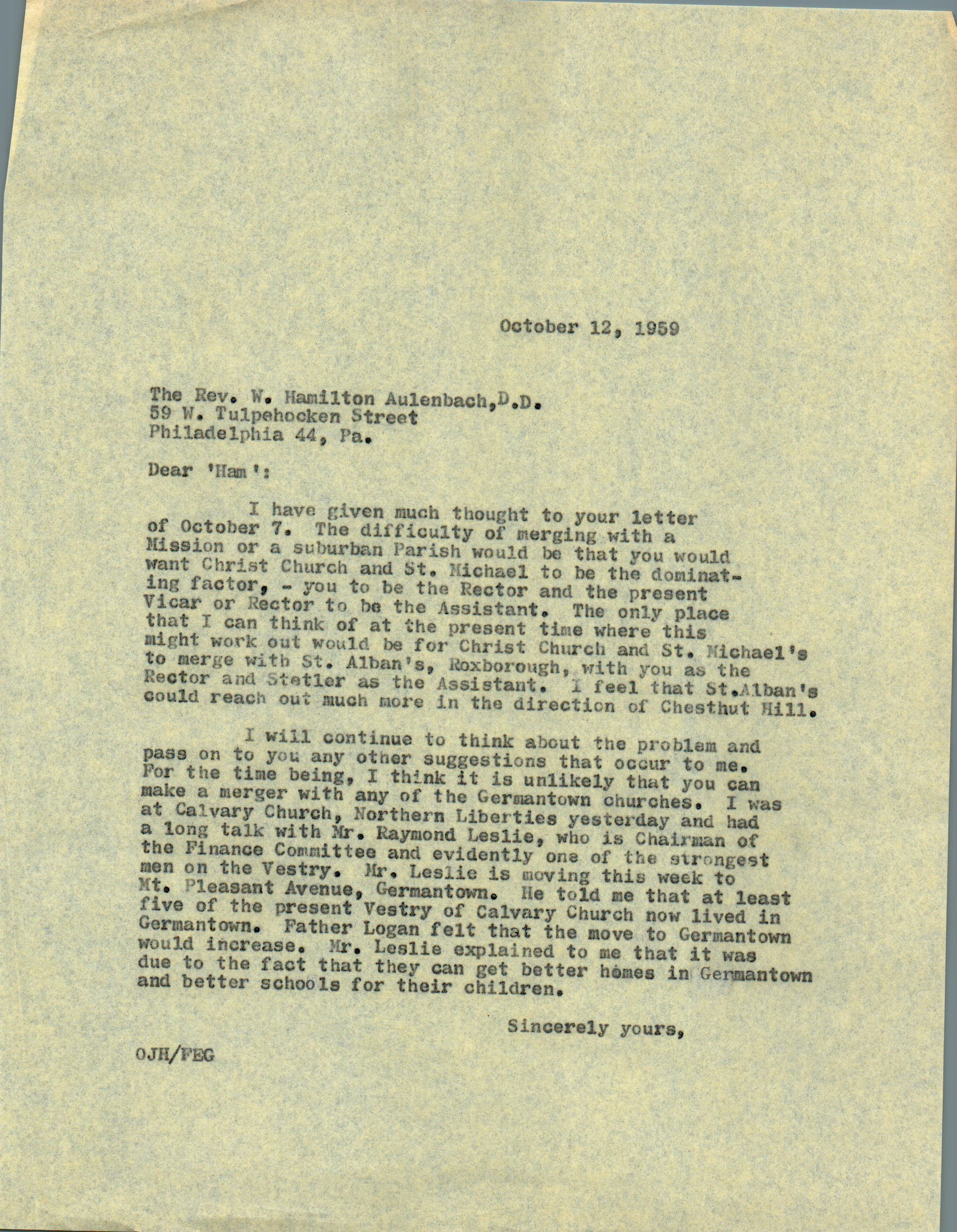 Letter from the Rt. Rev. Oliver J. Hart to Dr. W. Hamilton Aulenbach Regarding a Possible Merger Between a Suburban Parish and Christ Church and St. Michael, Germantown (1959)