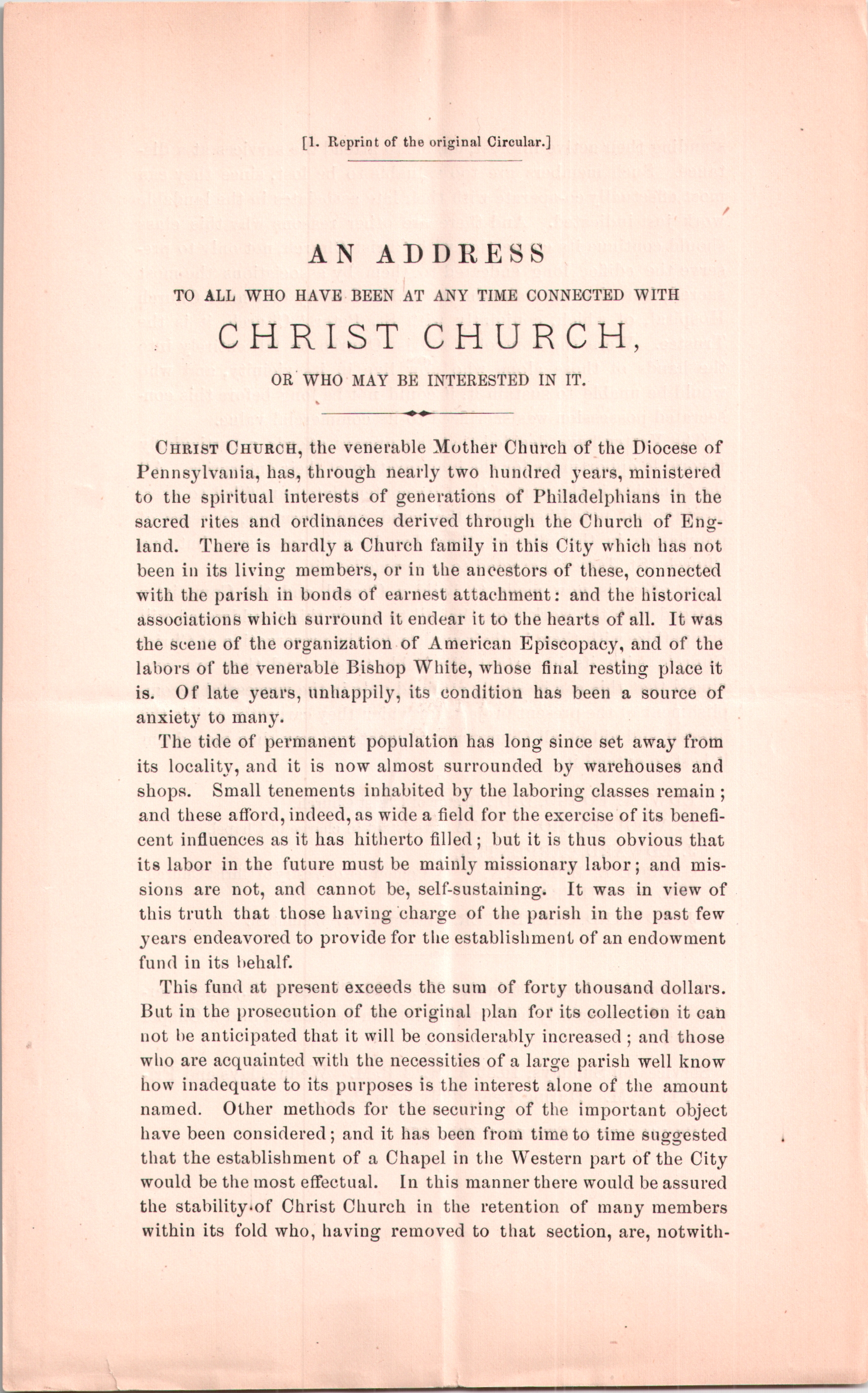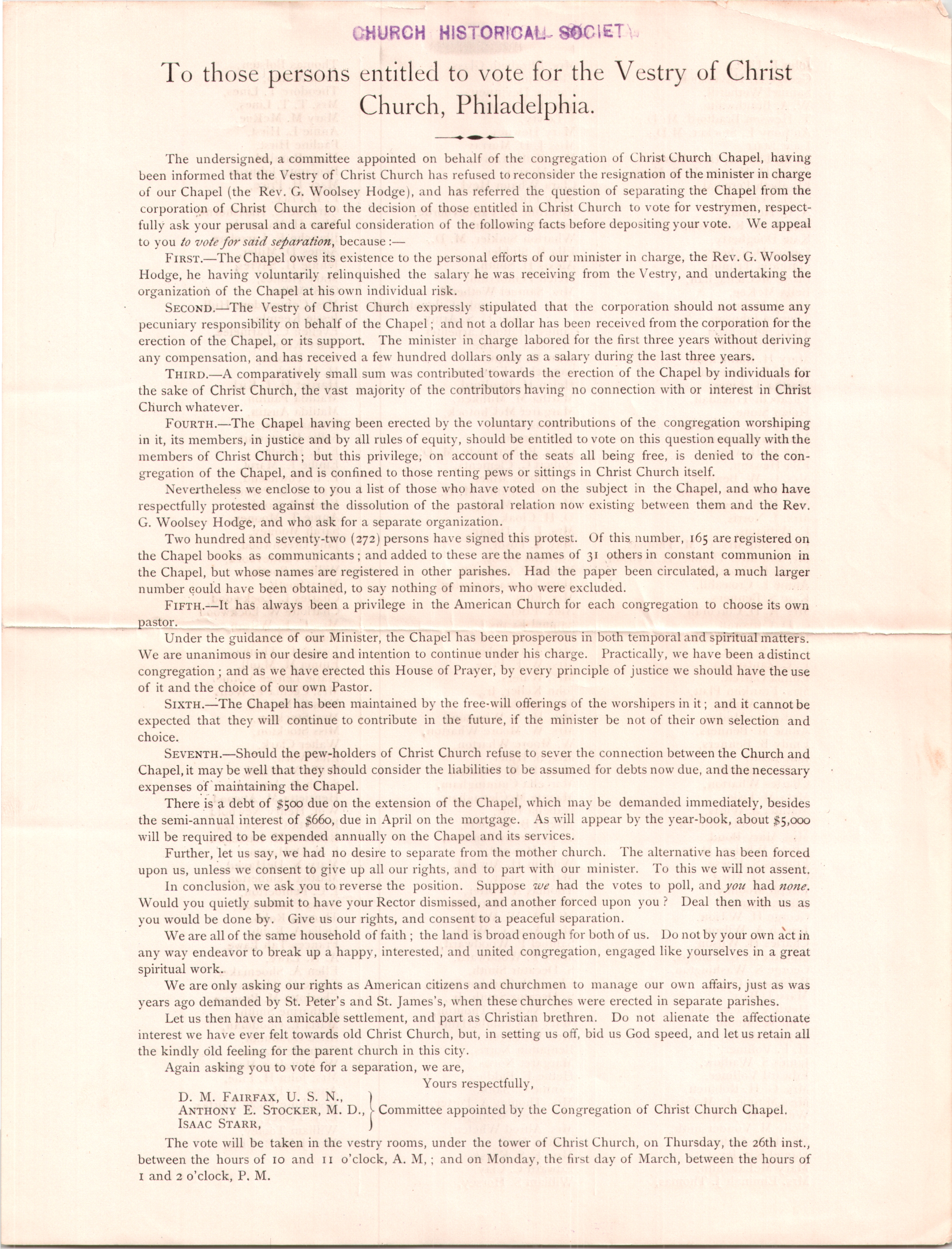 Protest Regarding Possible Changes to the Canons and Constitution of the Diocese of Pennsylvania Signed at Church of the Epiphany, Philadelphia (1879)