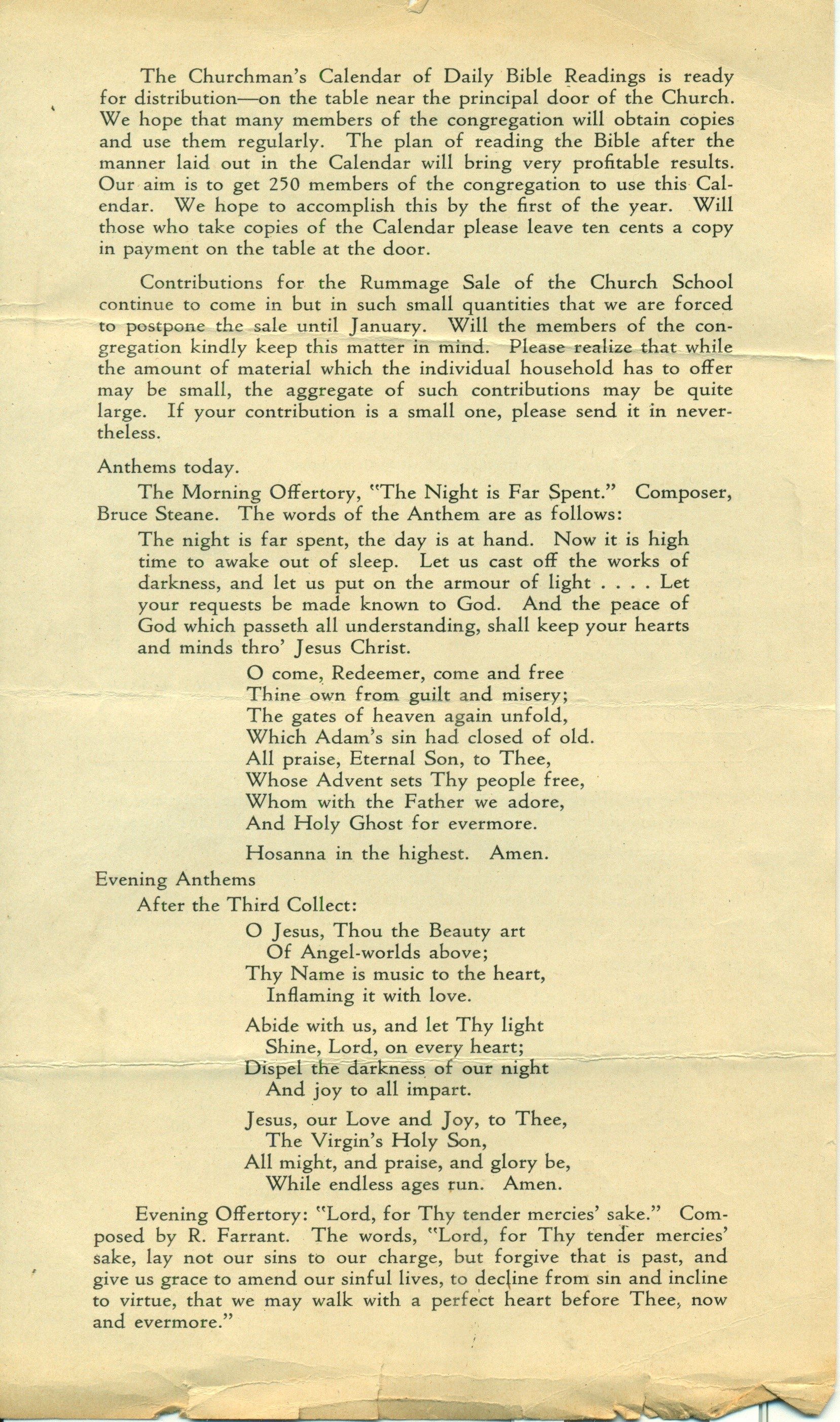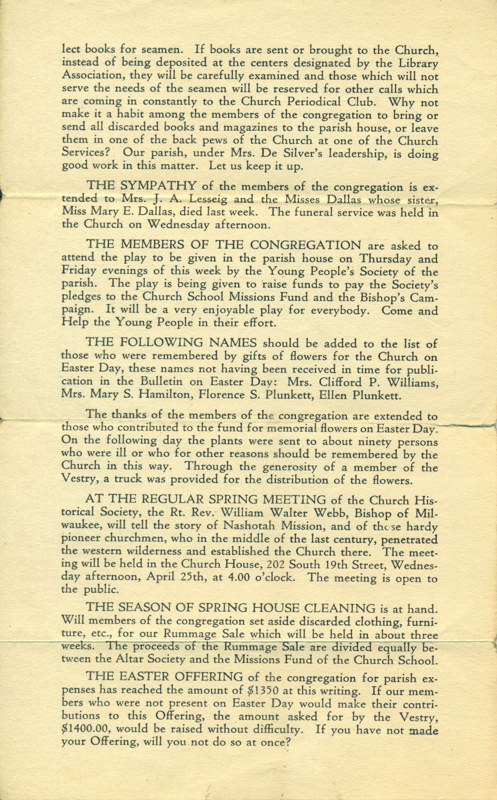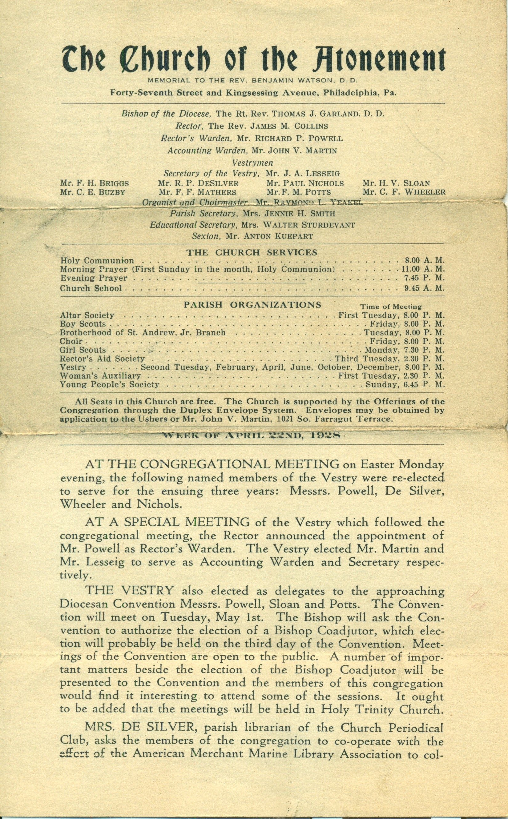 Bulletin for the Church of the Atonement for the Week of April 22, 1928
