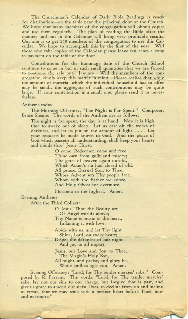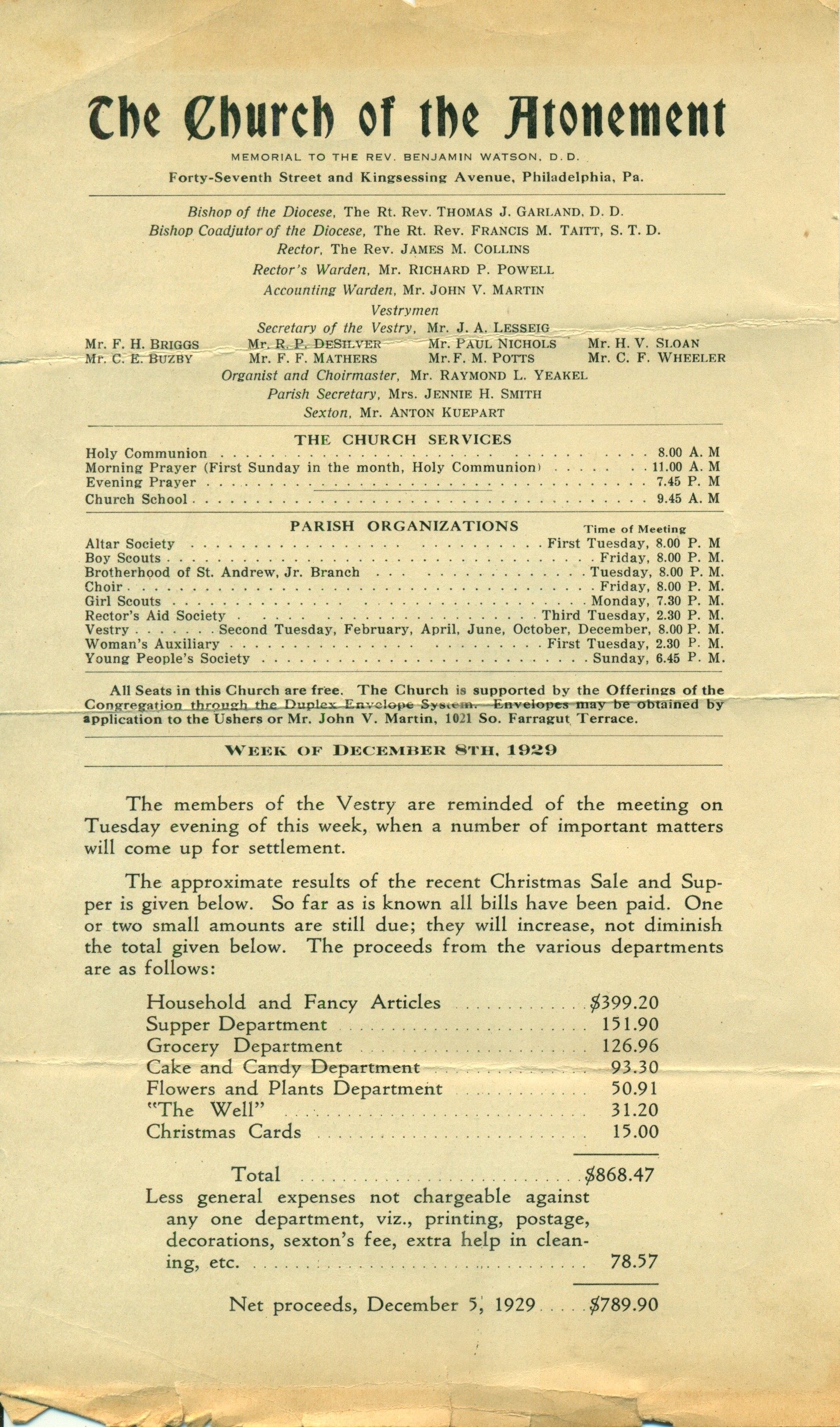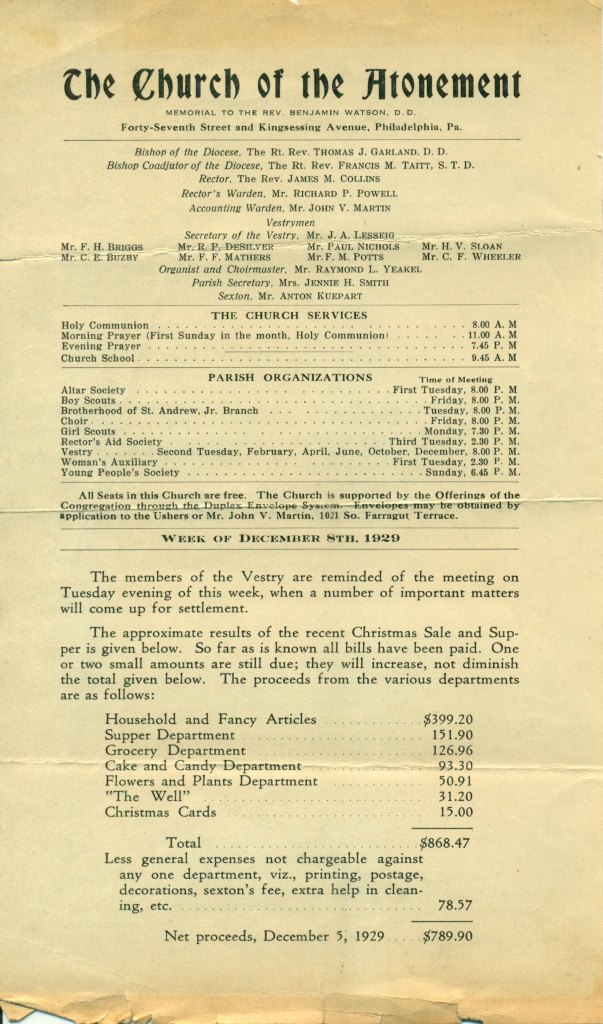 Bulletin for the Church of the Atonement for the Week of December 8, 1929
