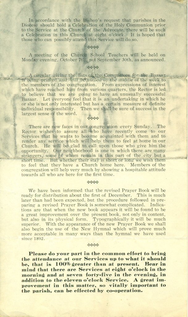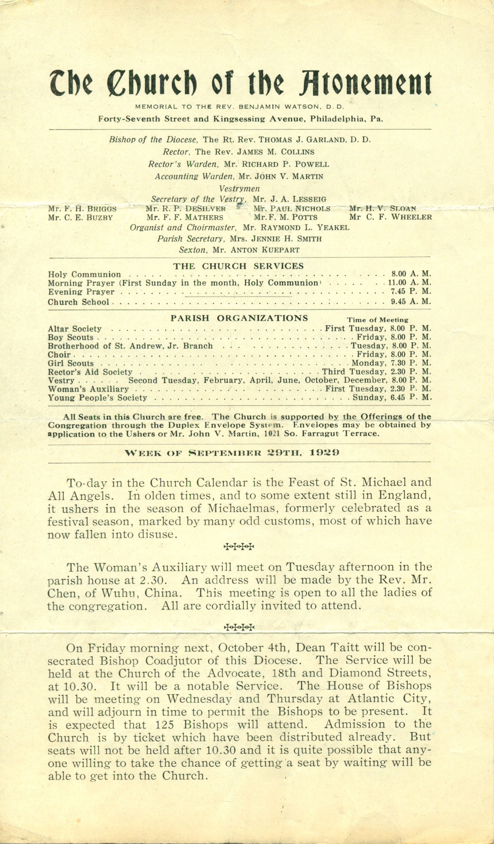 Bulletin for the Church of the Atonement for the Week of September 29, 1929