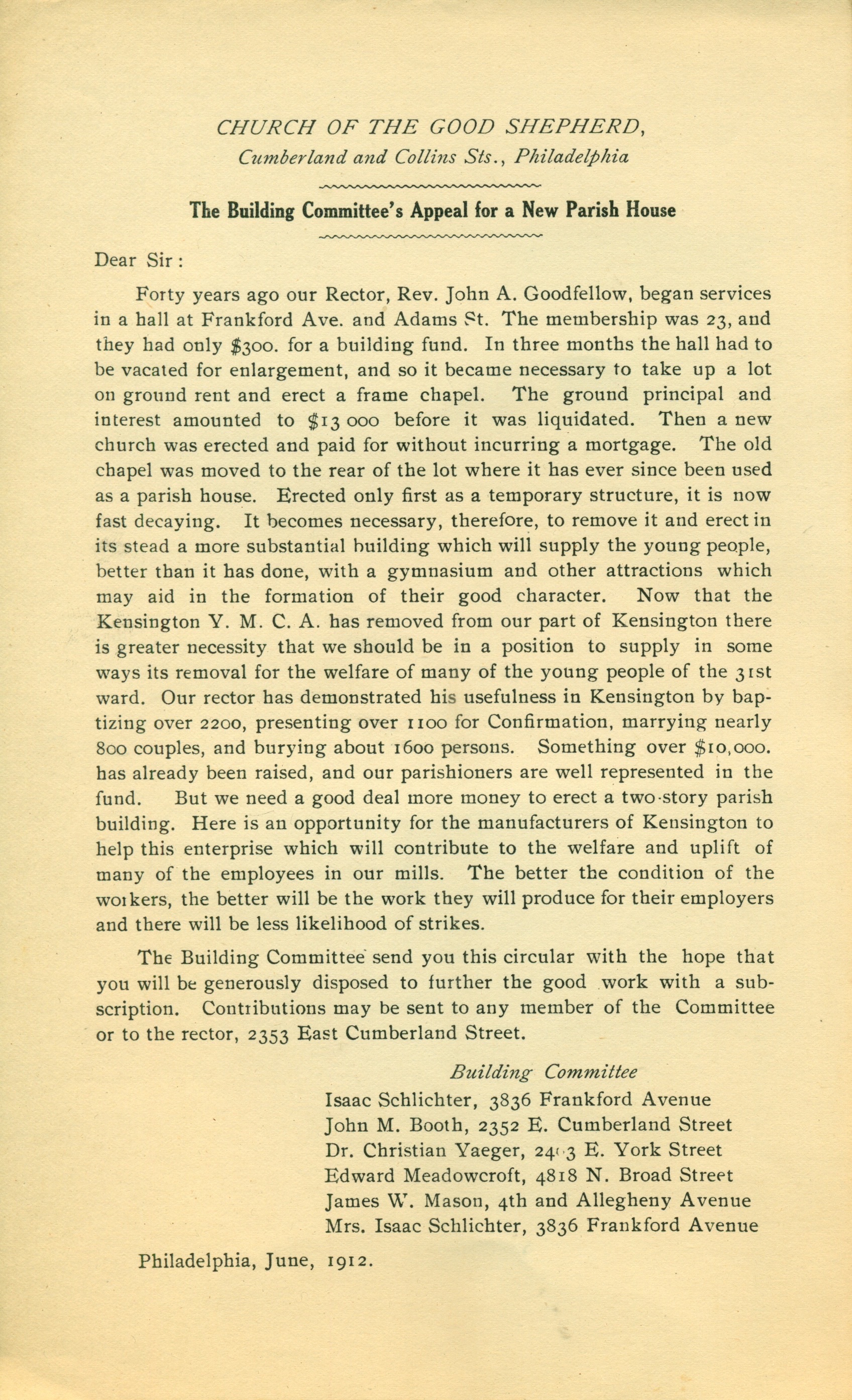 Building Committee’s Appeal for a New Parish House at Church of the Good Shepherd, Kensington (1912)