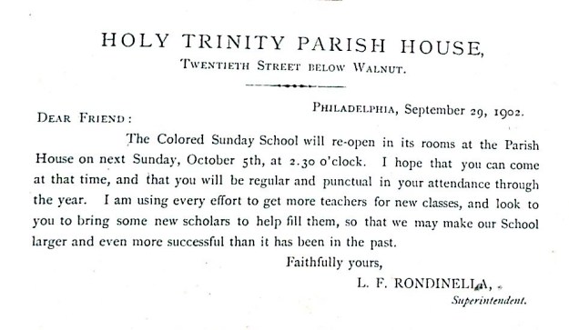 Notice of the Resumption of the African-American Sunday School at Church of the Holy Trinity, Rittenhouse Square (1902)