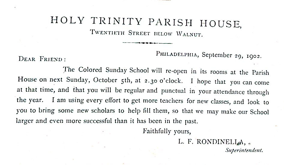 Notice of the Resumption of the African-American Sunday School at Church of the Holy Trinity, Rittenhouse Square (1902)