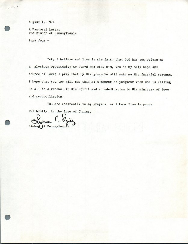 Letter from Rt. Rev. Lyman C. Ogilby Regarding the Ordination of Women at the George W. South Memorial Church of the Advocate (1974)