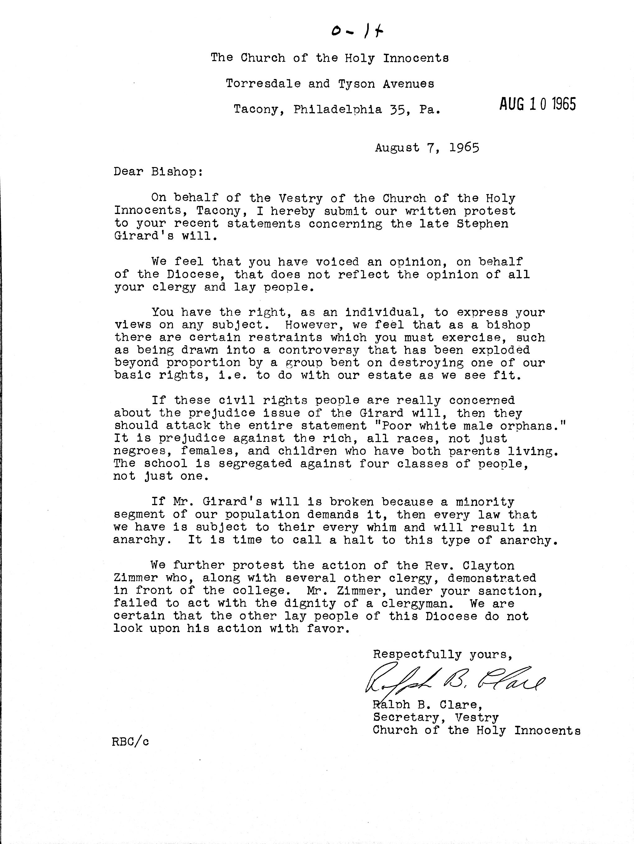 Letter to the Rt. Rev. Robert L. DeWitt Concerning Stephen Girard’s Will from the Vestry of Holy Innocents’ Church, Tacony (1965)