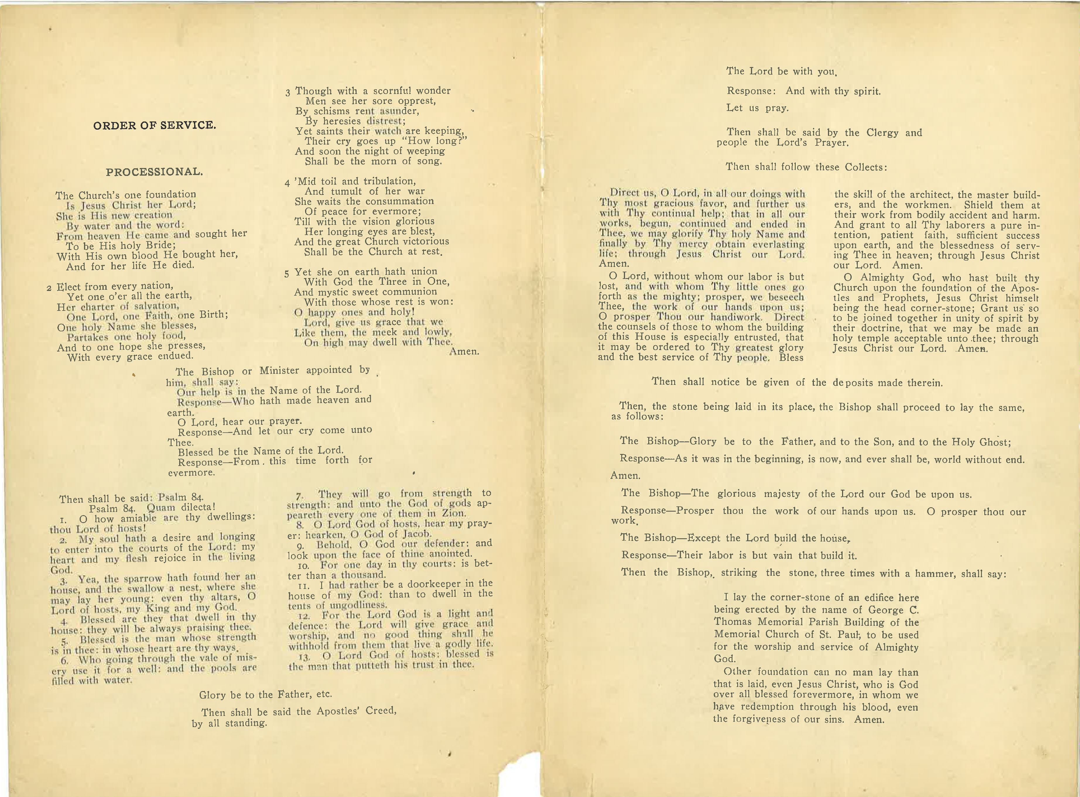 Order of Service for the Laying of the Cornerstone of George C. Thomas Memorial Parish Building at Memorial Church of St. Paul, South Philadelphia (1911)