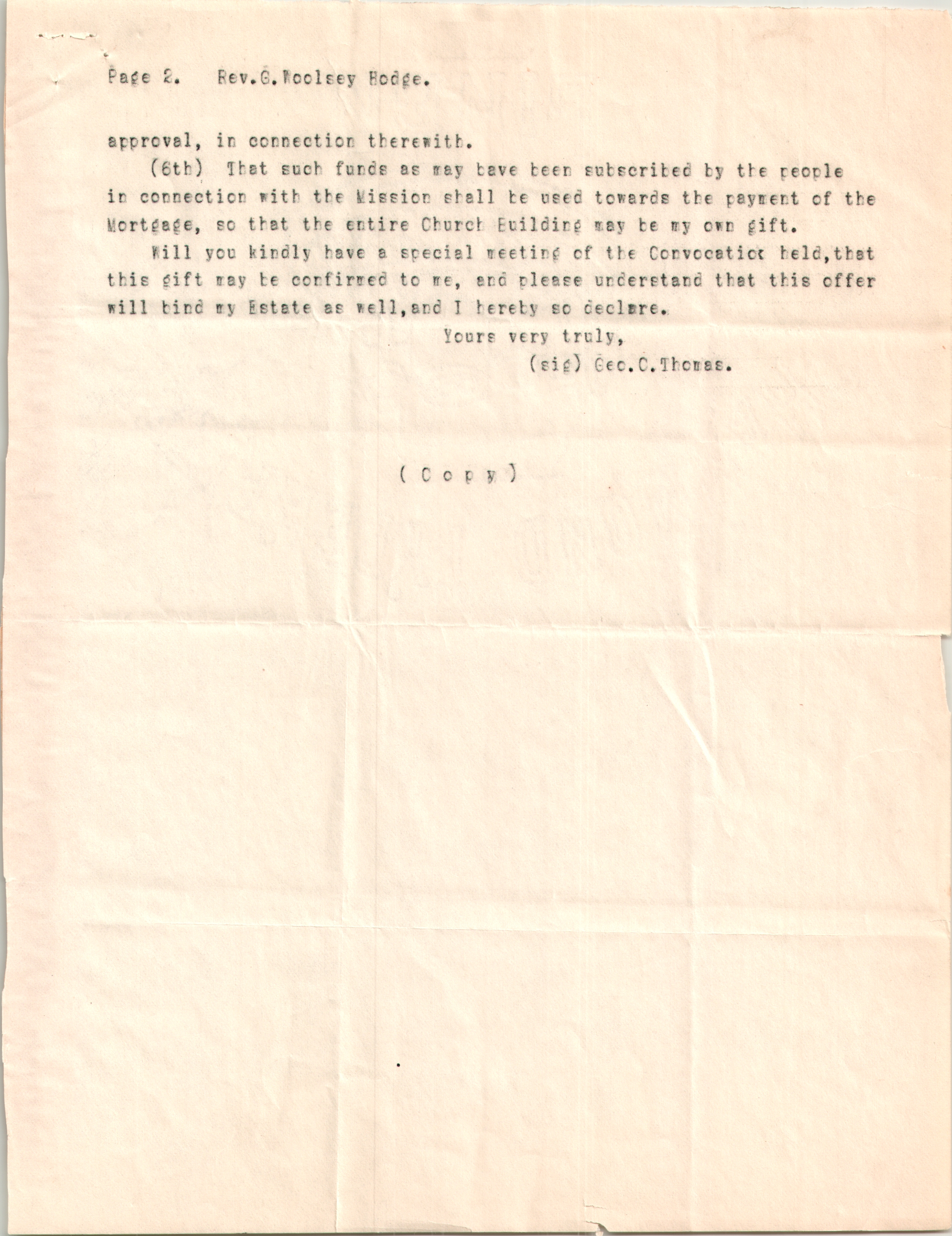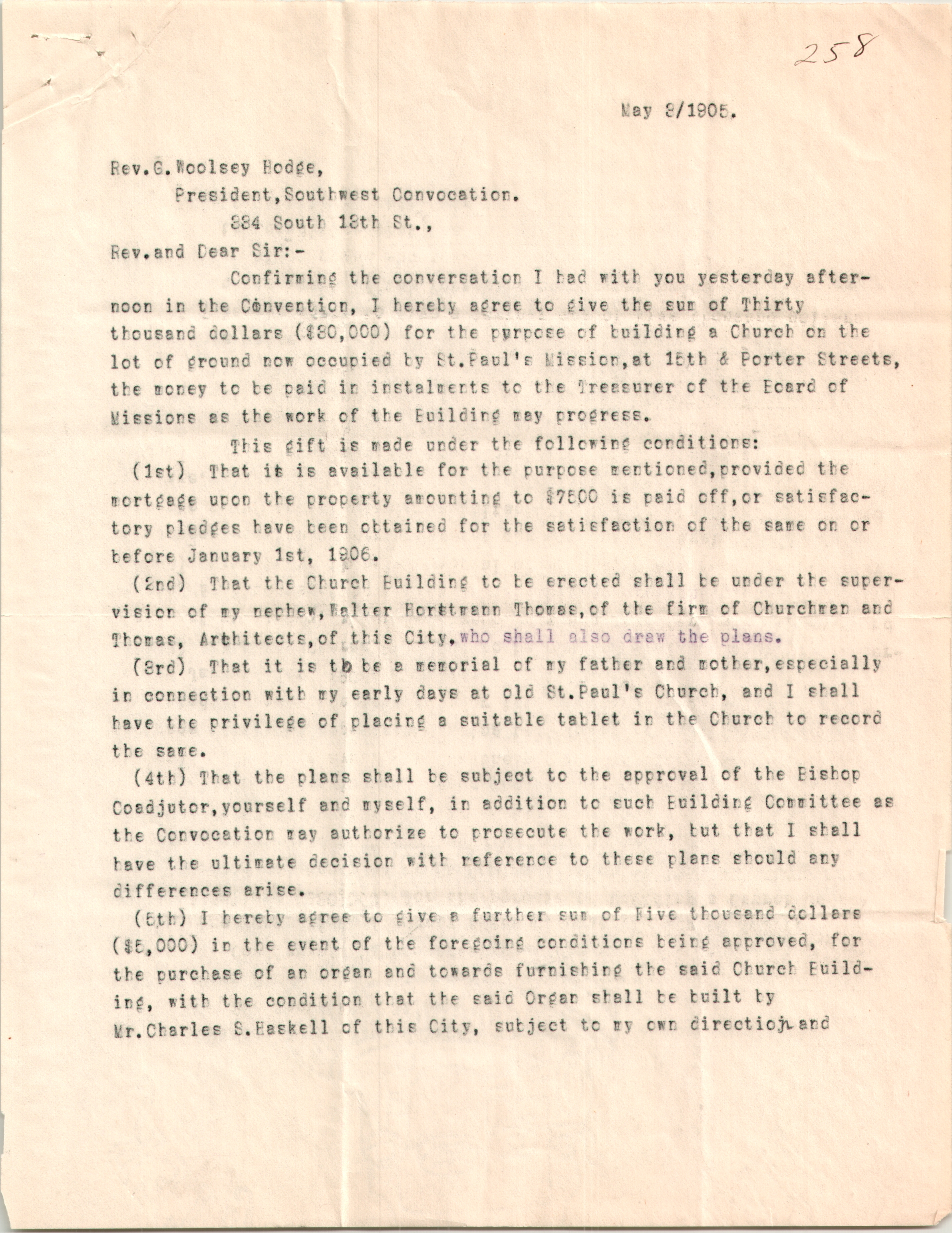 Letter from George C. Thomas Concerning the Construction of the Memorial Church of St. Paul, South Philadelphia (1905)