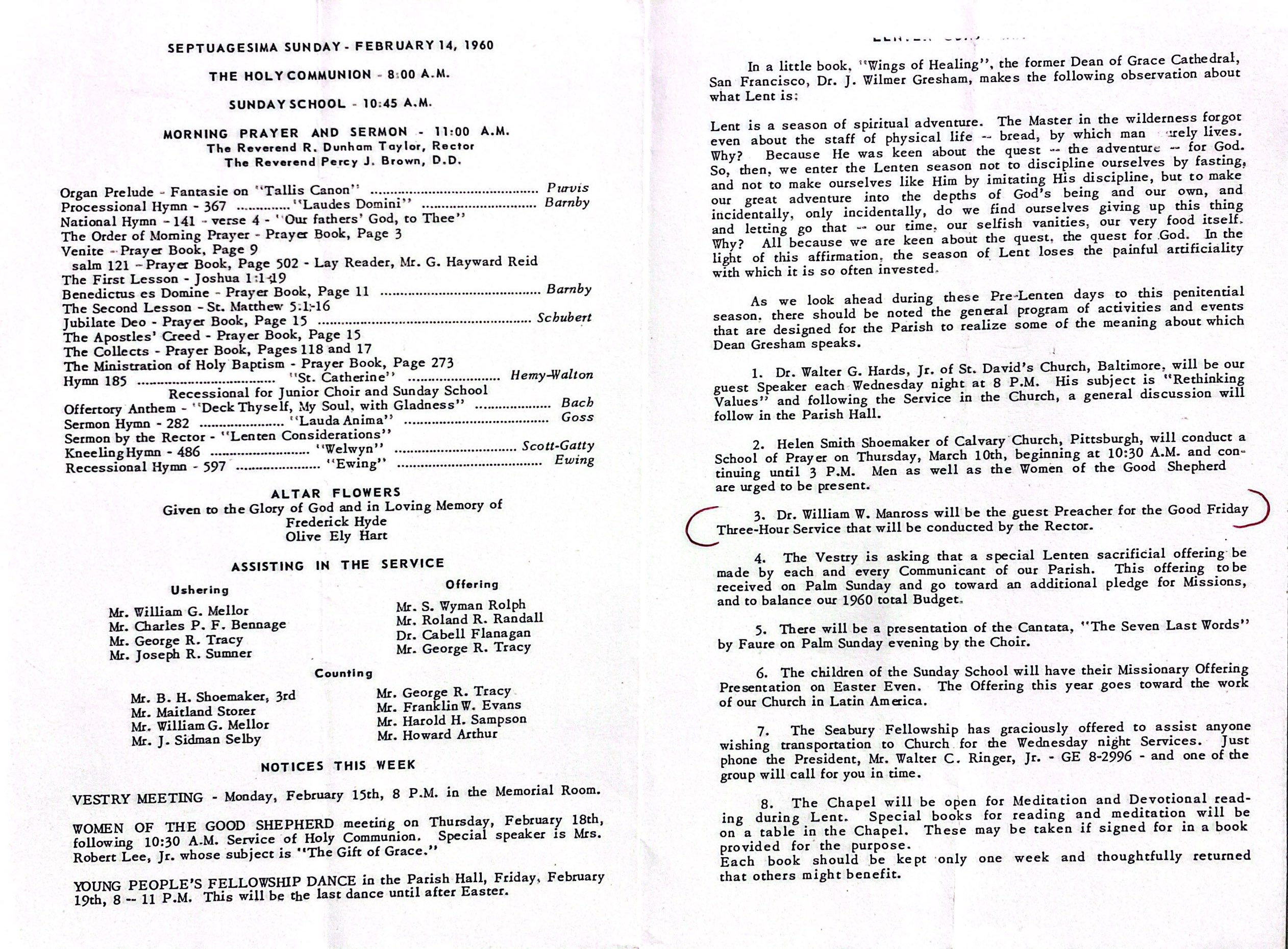 Service Leaflet for Septuagesima at Memorial Church of the Good Shepherd, Oak Road (1960)