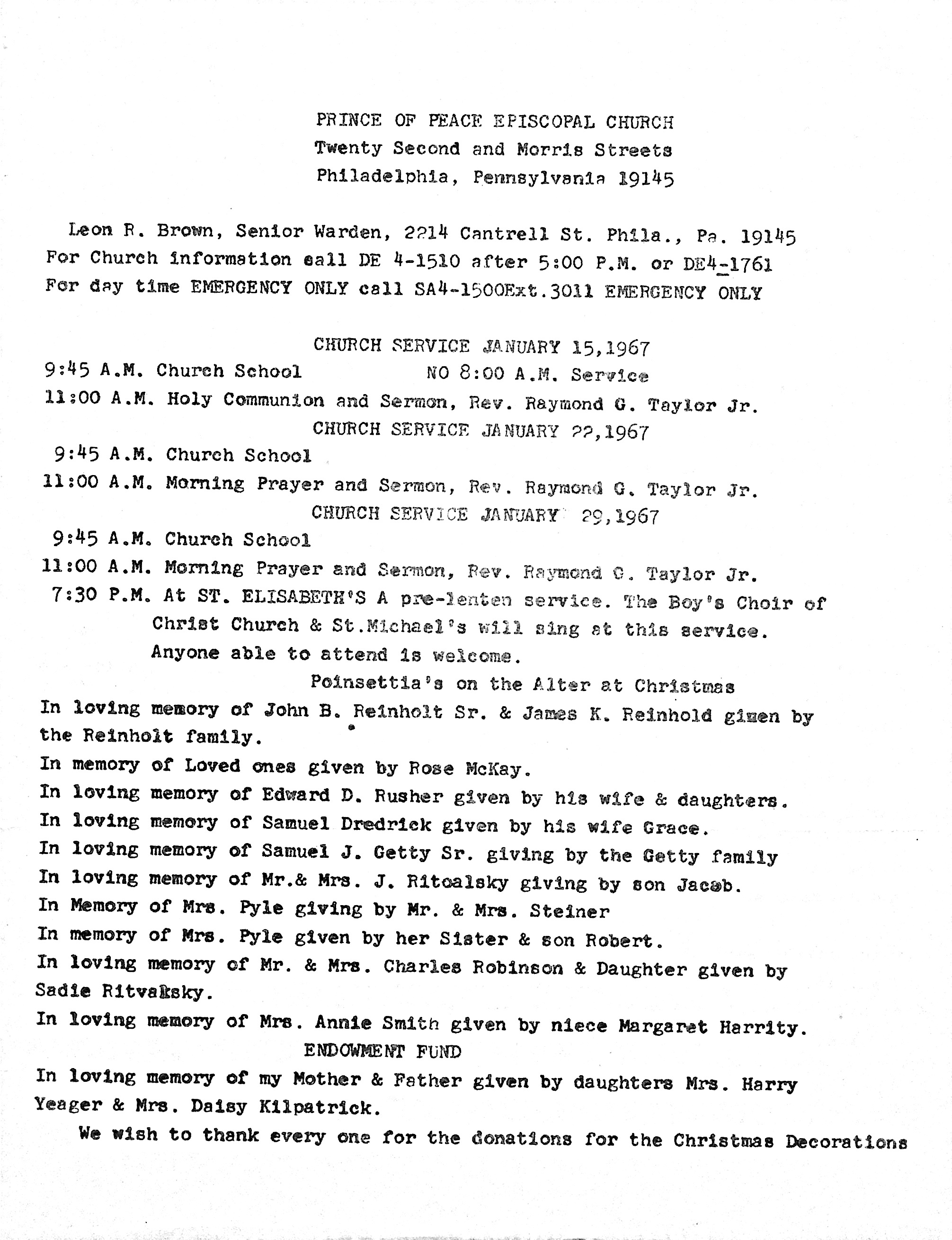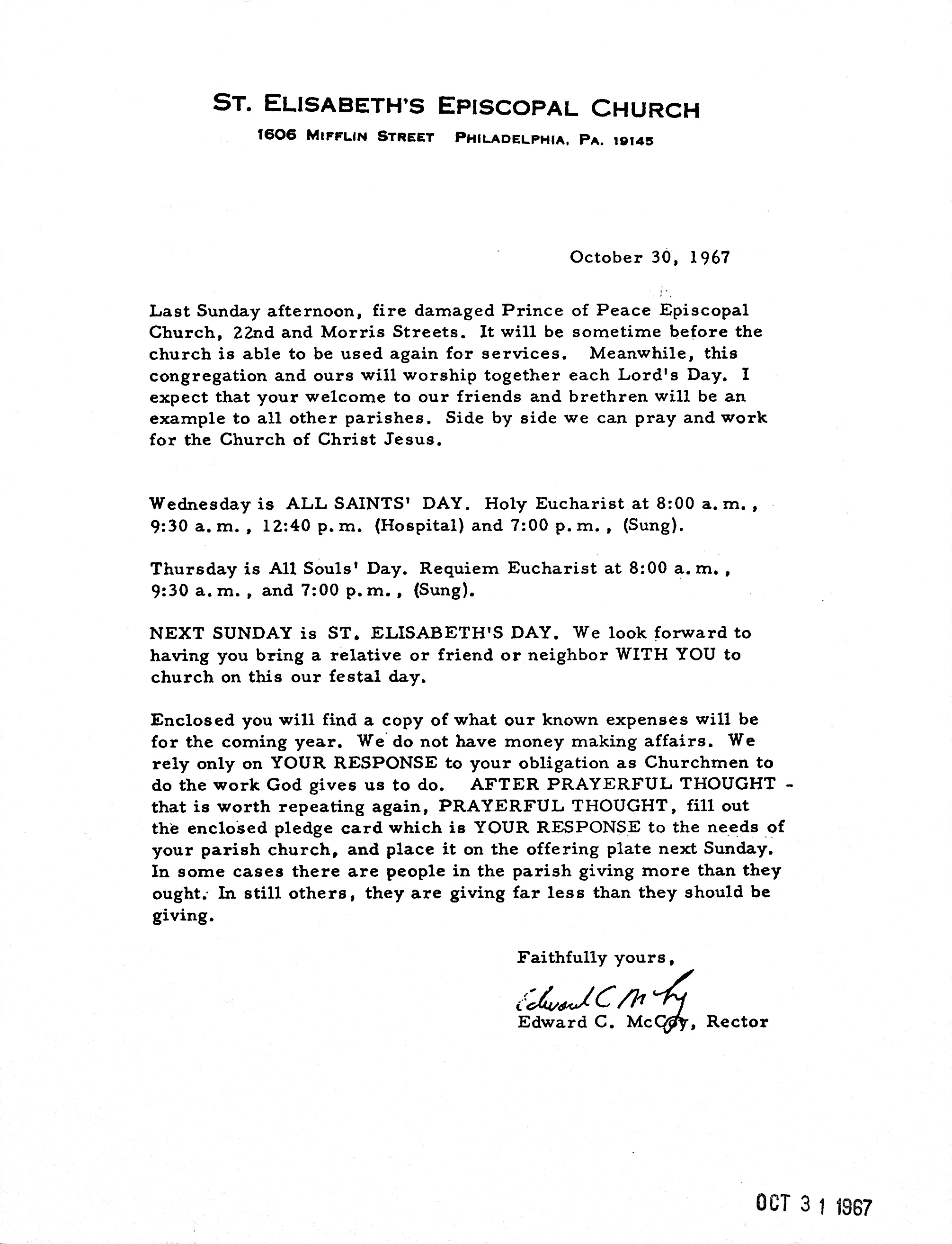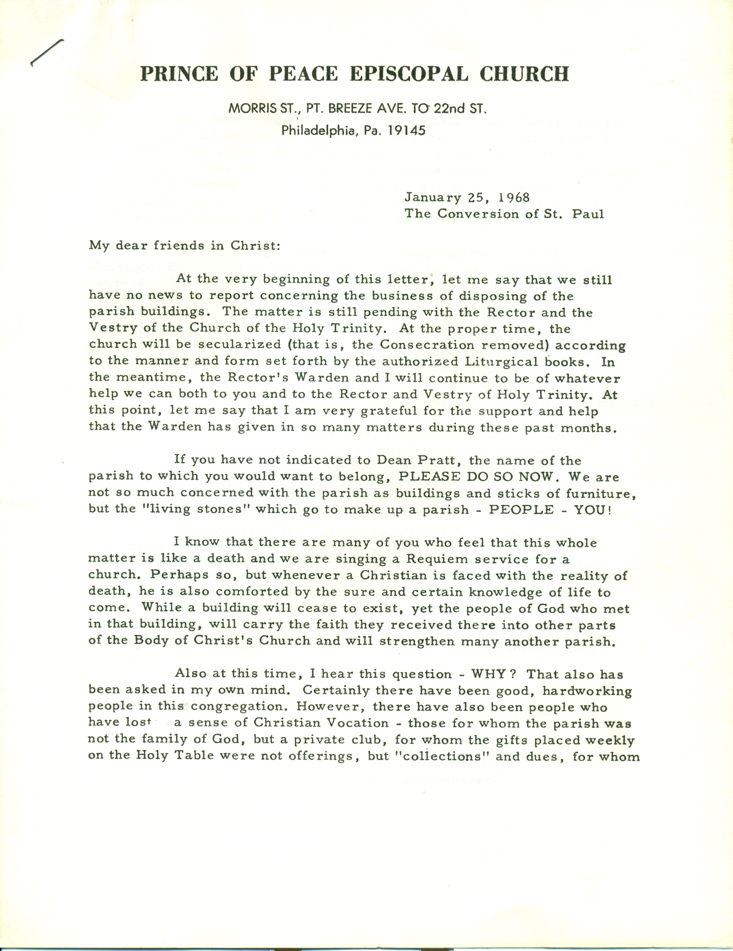 “The self-study has been started in the fall of 1963, carried out by the Division of Research and Field Study of the Executive Council of the Episcopal Church in New York. It was completed a year later. By the fall of 1965, the data had been organized and analyzed, and the results were ready to be reported and discussed…..The self-study was about people rather than property or finances, though the need for money is evident in the report. In many ways, the picture that emerged was one of which to be proud…The most depressing findings, however, had to do with the low state of morale and the weakness of the lines of communication among members of different parishes. Too many divisions existed. Race and class were the unspoken divides here. Lay leadership did not seem especially strong to the study group, nor were the Convocations, or regional groupings, very effective. Furthermore, the number of communicants were flat, while the population in the metropolitan area was growing.” – Sheldon Hackney, This Far By Faith: Tradition and Change in the Episcopal Diocese of Pennsylvania, pp. 308-309.