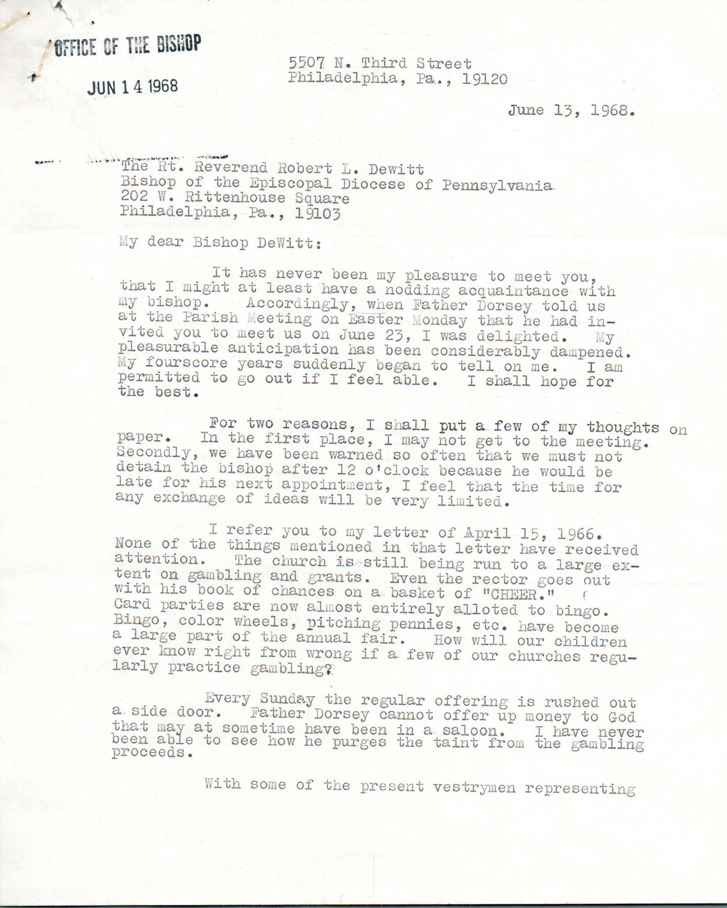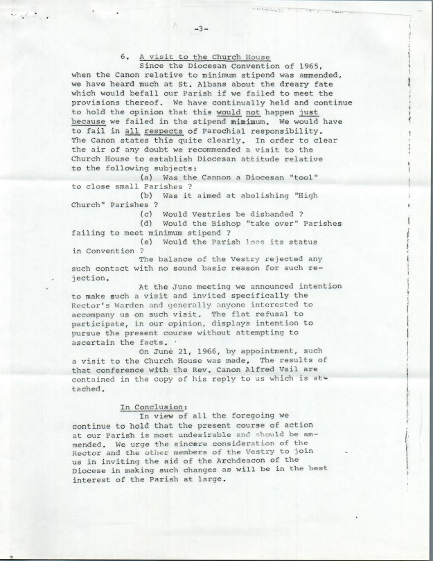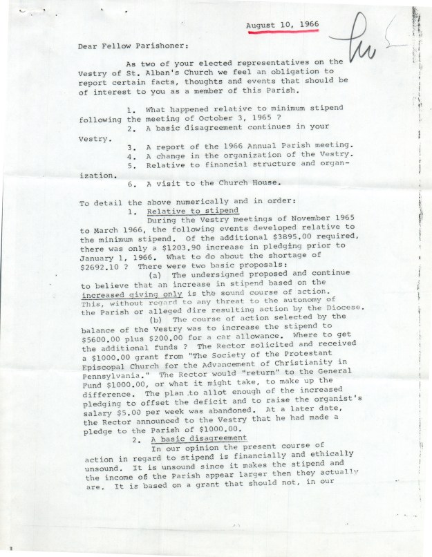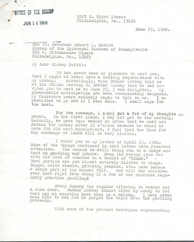 “The self-study has been started in the fall of 1963, carried out by the Division of Research and Field Study of the Executive Council of the Episcopal Church in New York. It was completed a year later. By the fall of 1965, the data had been organized and analyzed, and the results were ready to be reported and discussed…..The self-study was about people rather than property or finances, though the need for money is evident in the report. In many ways, the picture that emerged was one of which to be proud…The most depressing findings, however, had to do with the low state of morale and the weakness of the lines of communication among members of different parishes. Too many divisions existed. Race and class were the unspoken divides here. Lay leadership did not seem especially strong to the study group, nor were the Convocations, or regional groupings, very effective. Furthermore, the number of communicants were flat, while the population in the metropolitan area was growing.” – Sheldon Hackney, This Far By Faith: Tradition and Change in the Episcopal Diocese of Pennsylvania, pp. 308-309.