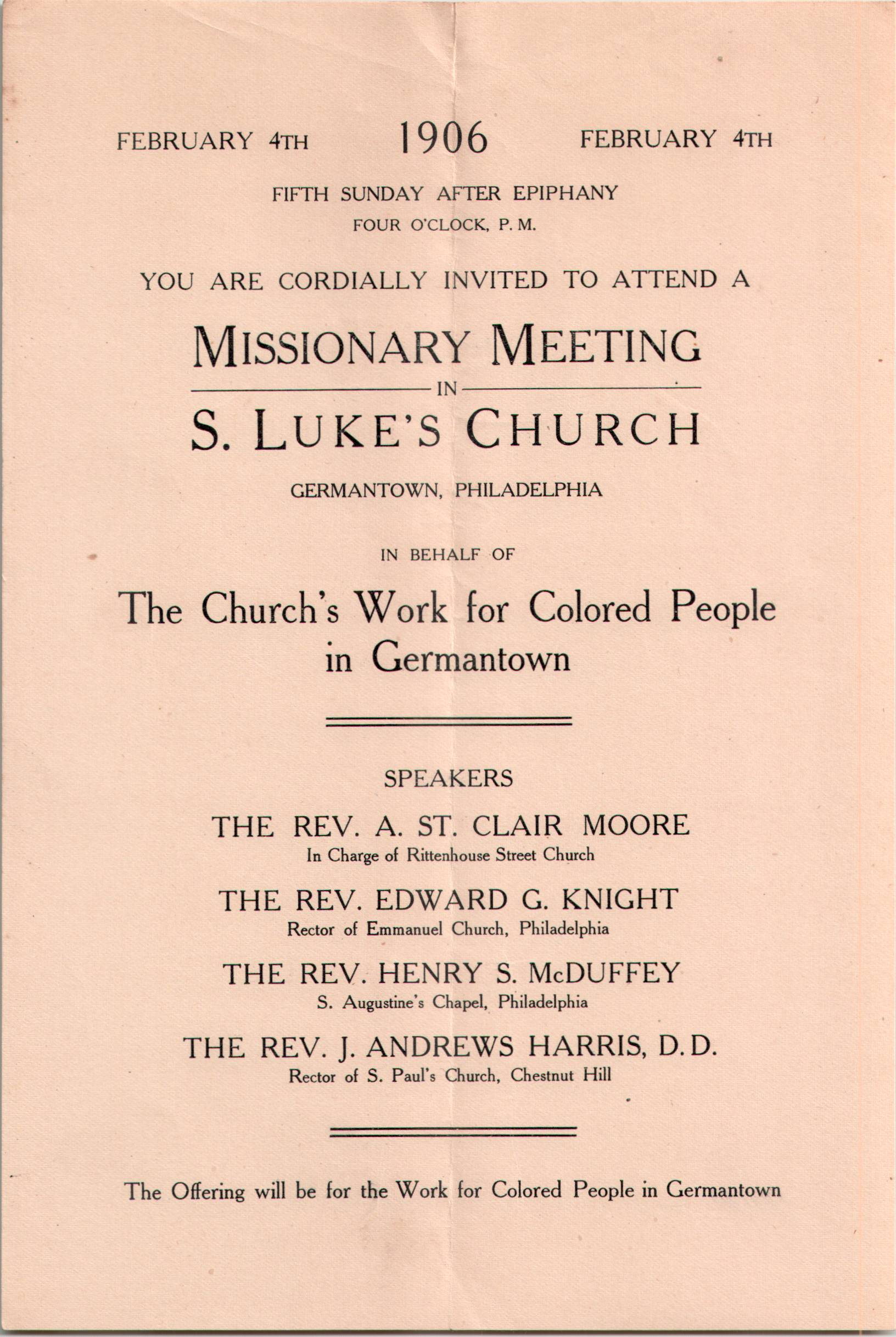 Notice of the Missionary Meeting in behalf of The Church’s Work for [African-Americans] in Germantown at St. Luke’s Church, Germantown (1906)