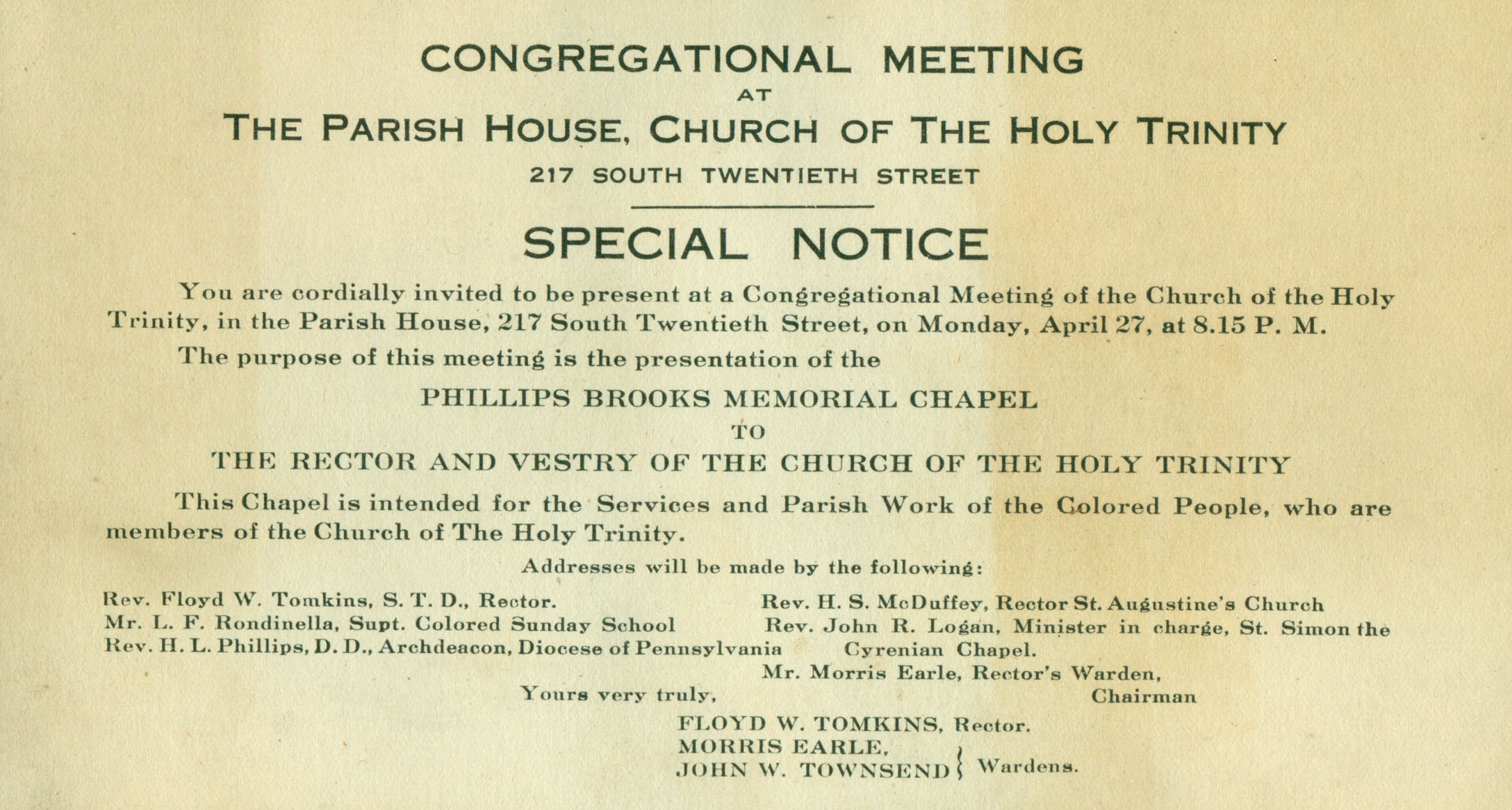 Notice of the Congregational Meeting Regarding the Phillips Brooks Memorial Chapel of the Church of the Holy Trinity, Rittenhouse Square (1914)