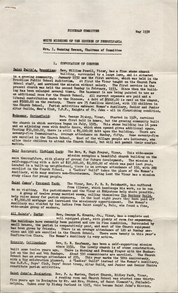 Report on White Missions of the Diocese of Pennsylvania (1938)