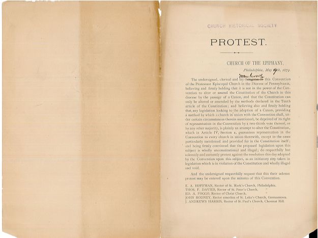Protest Regarding Possible Changes to the Canons and Constitution of the Diocese of Pennsylvania Signed at Church of the Epiphany, Philadelphia (1879)