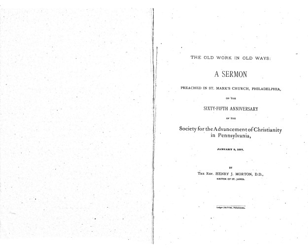 The Old Work in Old Ways: A Sermon Preached in St. Mark’s Church, Philadelphia, on the Sixth-Fifth Anniversary of the Society for the Advacement of Christianity in Pennsylvania by the Rev. Henry J. Morton, Rector of St. James’s Church, Philadelphia (1877)