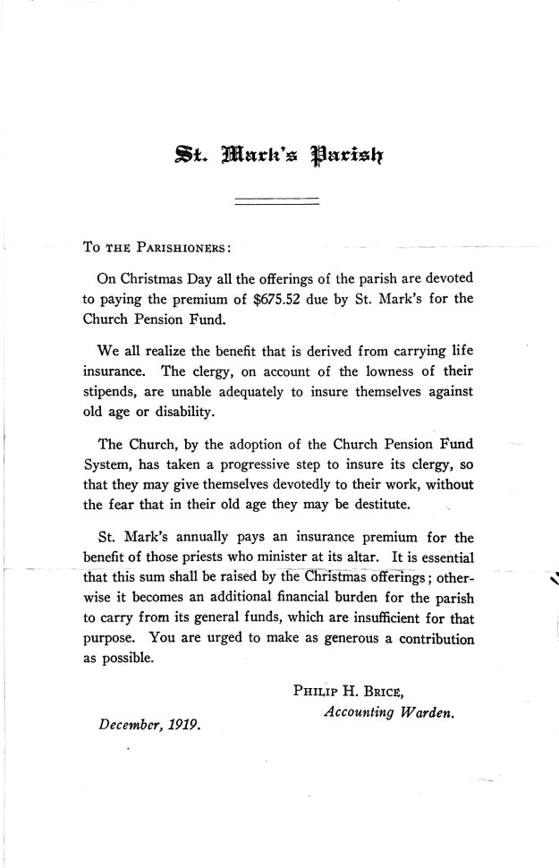 Stewardship Letter at St. Mark’s Church, Philadelphia for 1919