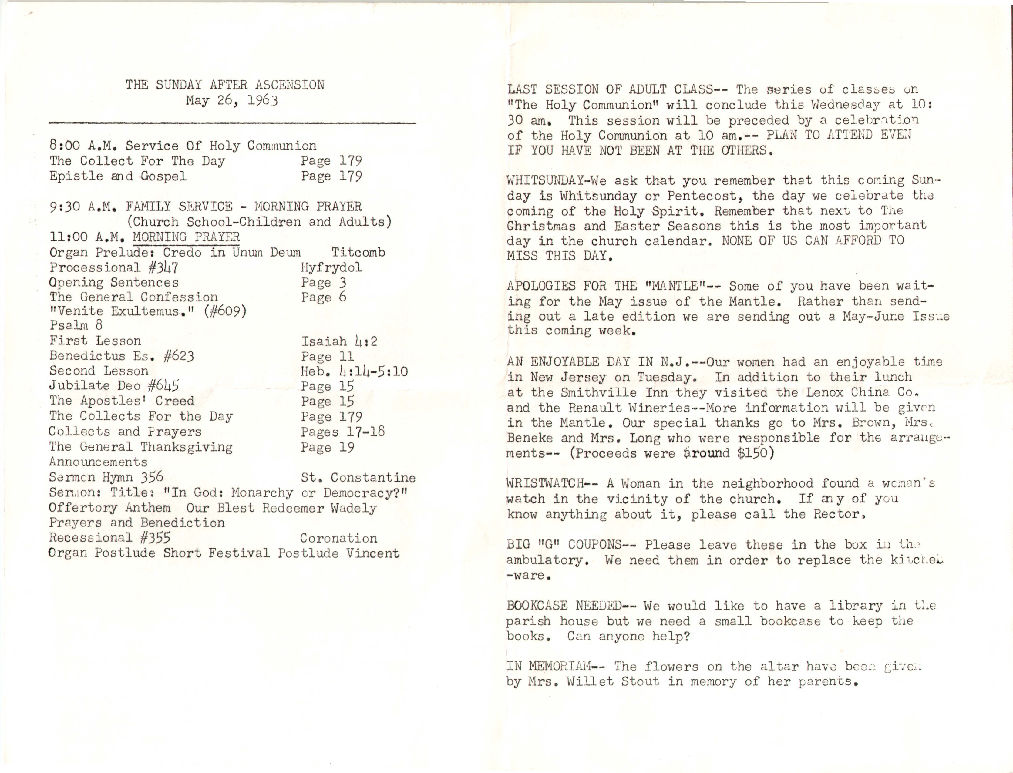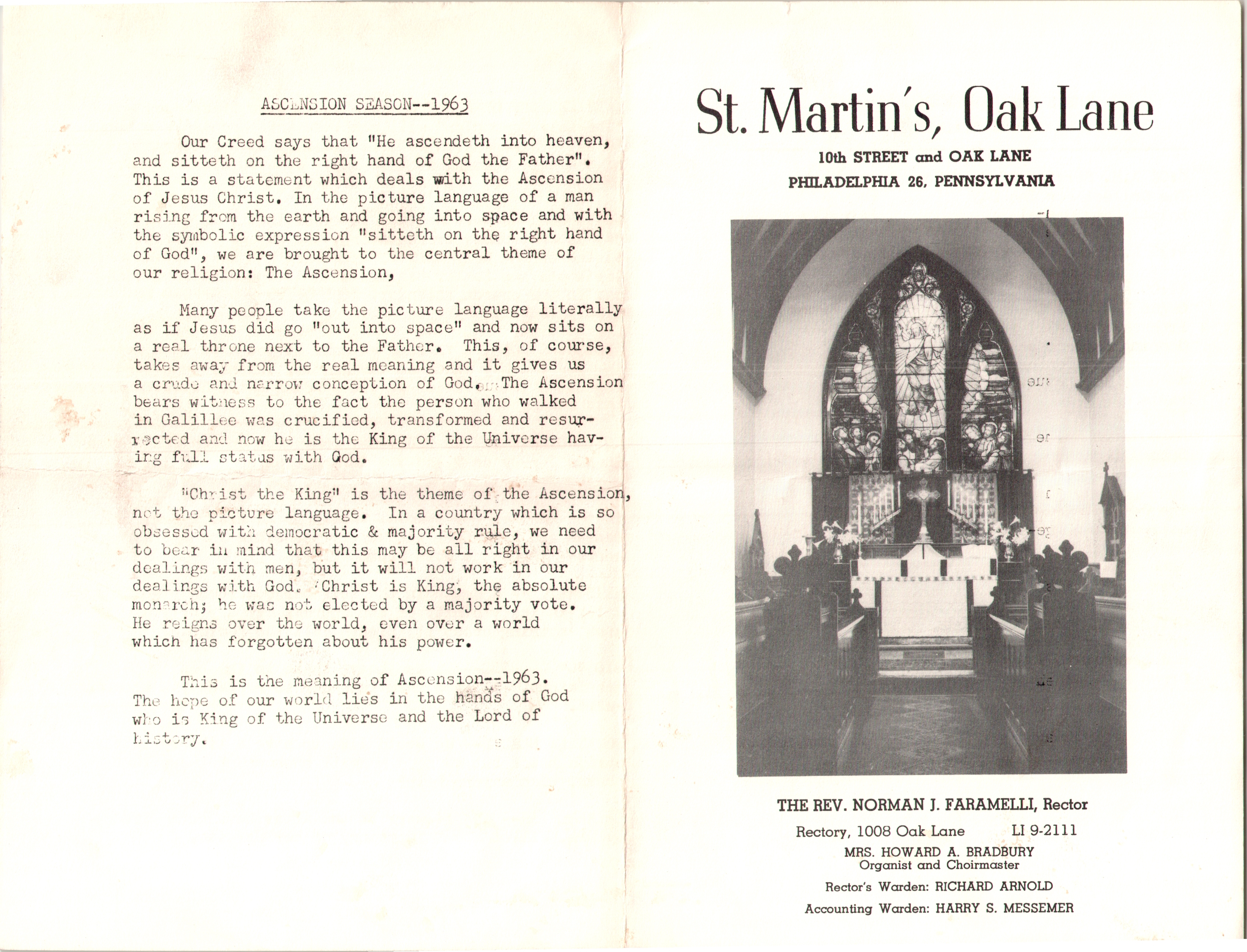 Service Leaflet for the Sunday after Ascension at St. Martin’s Church, Oak Lane (1963)