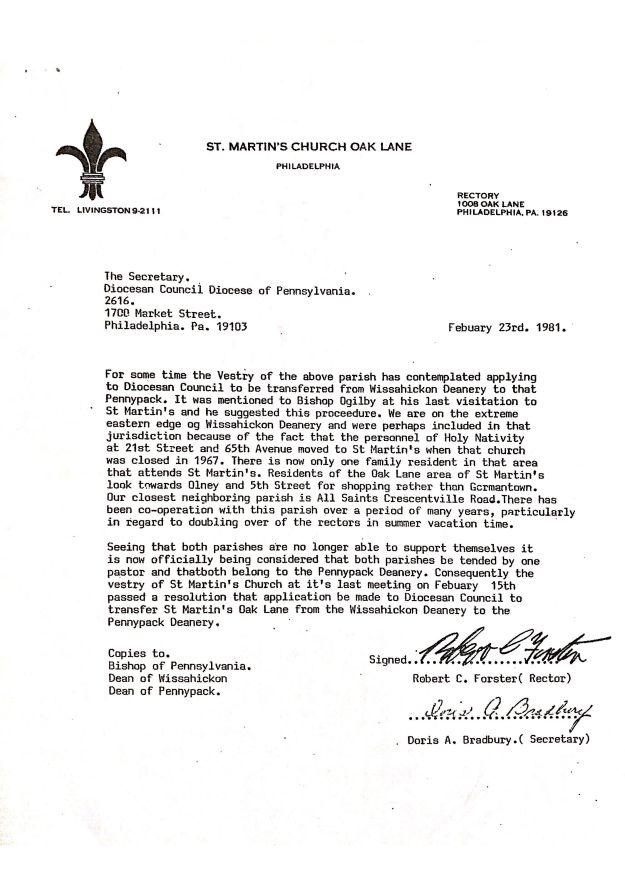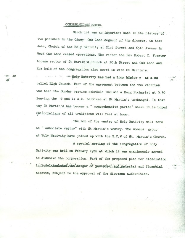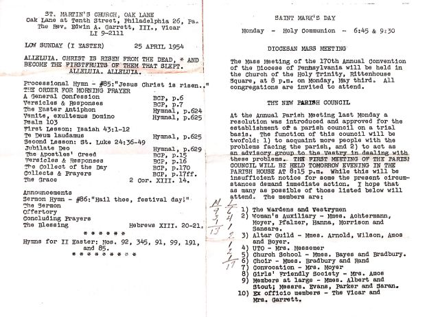“The self-study has been started in the fall of 1963, carried out by the Division of Research and Field Study of the Executive Council of the Episcopal Church in New York. It was completed a year later. By the fall of 1965, the data had been organized and analyzed, and the results were ready to be reported and discussed…..The self-study was about people rather than property or finances, though the need for money is evident in the report. In many ways, the picture that emerged was one of which to be proud…The most depressing findings, however, had to do with the low state of morale and the weakness of the lines of communication among members of different parishes. Too many divisions existed. Race and class were the unspoken divides here. Lay leadership did not seem especially strong to the study group, nor were the Convocations, or regional groupings, very effective. Furthermore, the number of communicants were flat, while the population in the metropolitan area was growing.” – Sheldon Hackney, This Far By Faith: Tradition and Change in the Episcopal Diocese of Pennsylvania, pp. 308-309.
