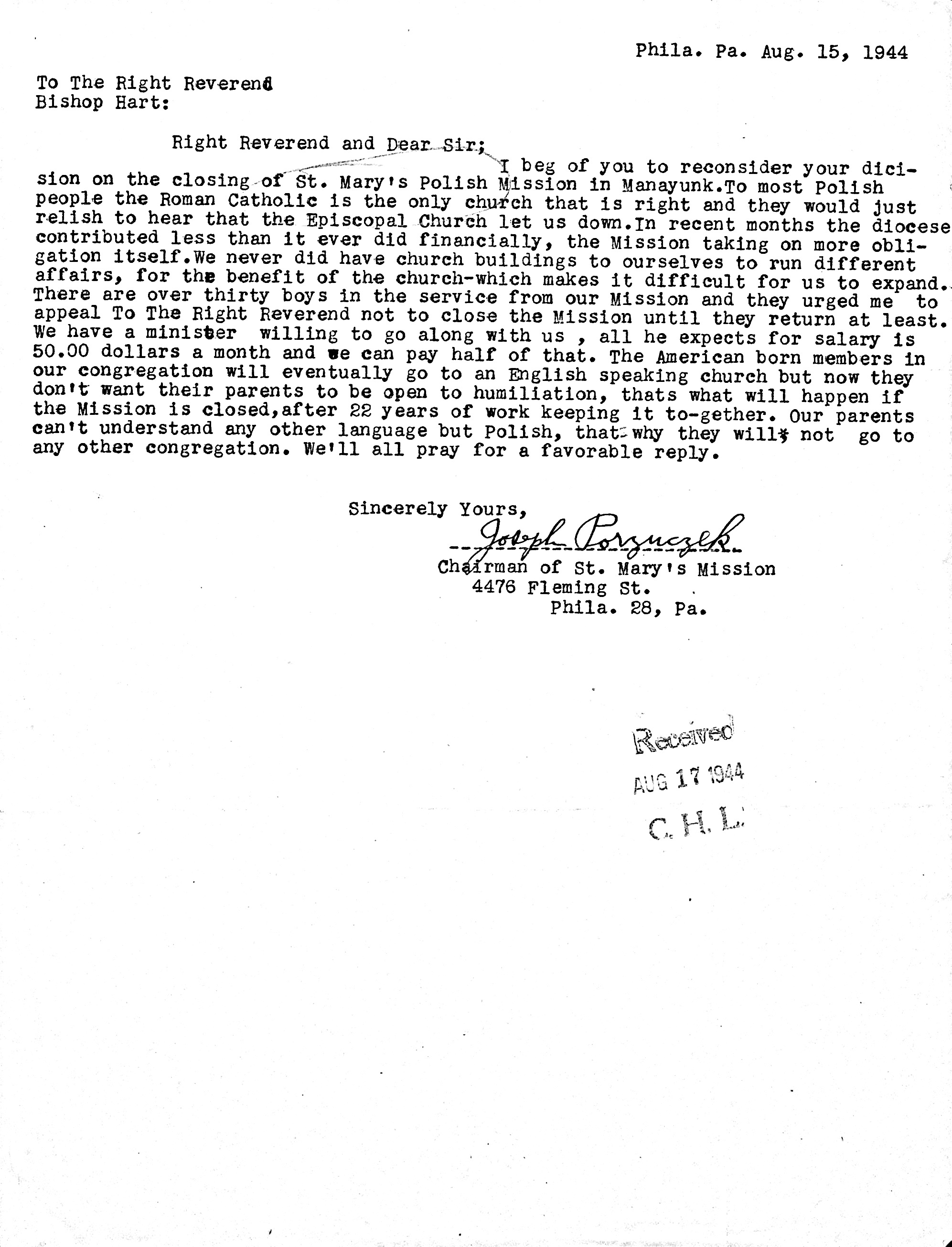 Letter to the Rt. Rev. Oliver J. Hart Concerning the Closure of St. Mary’s Mission (Polish), Manayunk (1944)