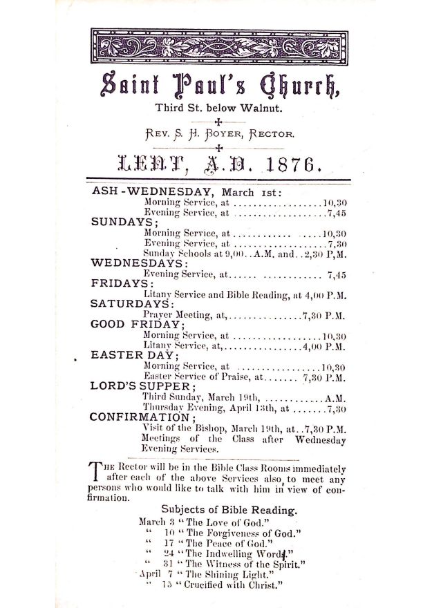 Listing of Lenten Week-Day Services of Philadelphia Parishes (1870s)