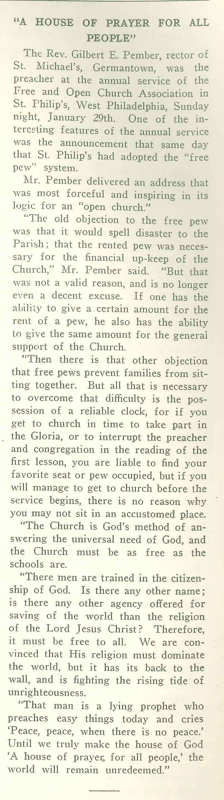 Selections from Rev. Gilbert E. Pember, Rector of St. Michael’s, Germantown, Sermon at the Annual Service of the Free and Open Church Association Meeting at St. Philip’s Church (1922)