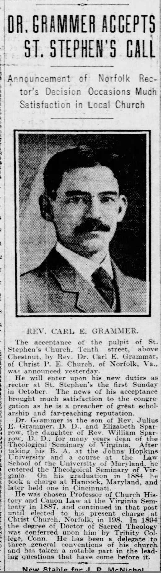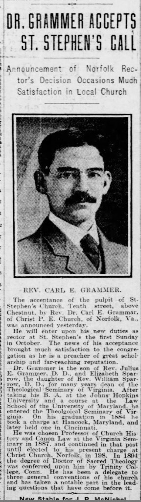 Rev. Carl E. Grammer Accepts Rectorship at St. Stephen’s Church, Philadelphia (1905)