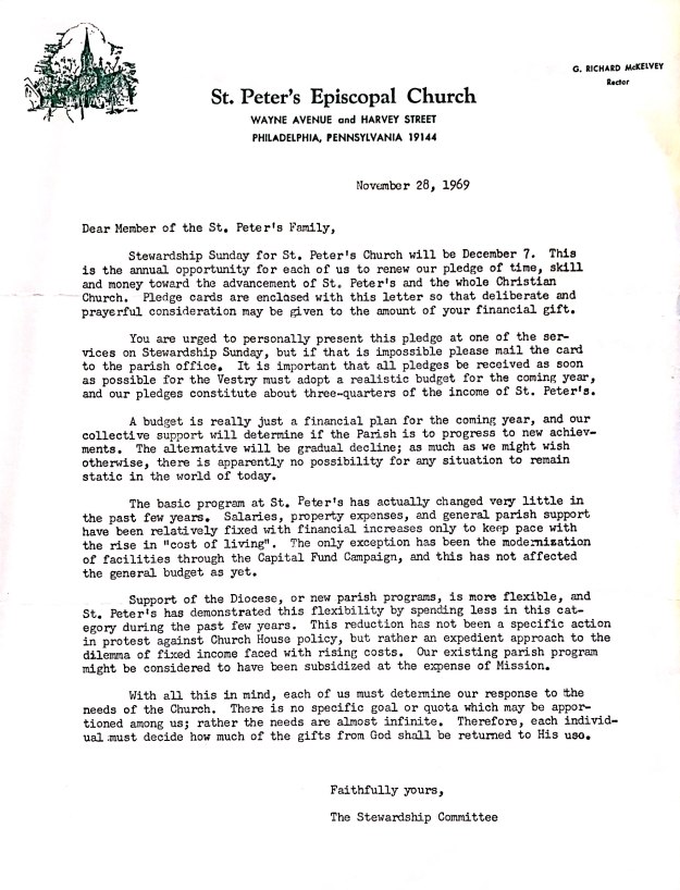 Stewardship Letter for St. Peter’s Church, Germantown (1969)