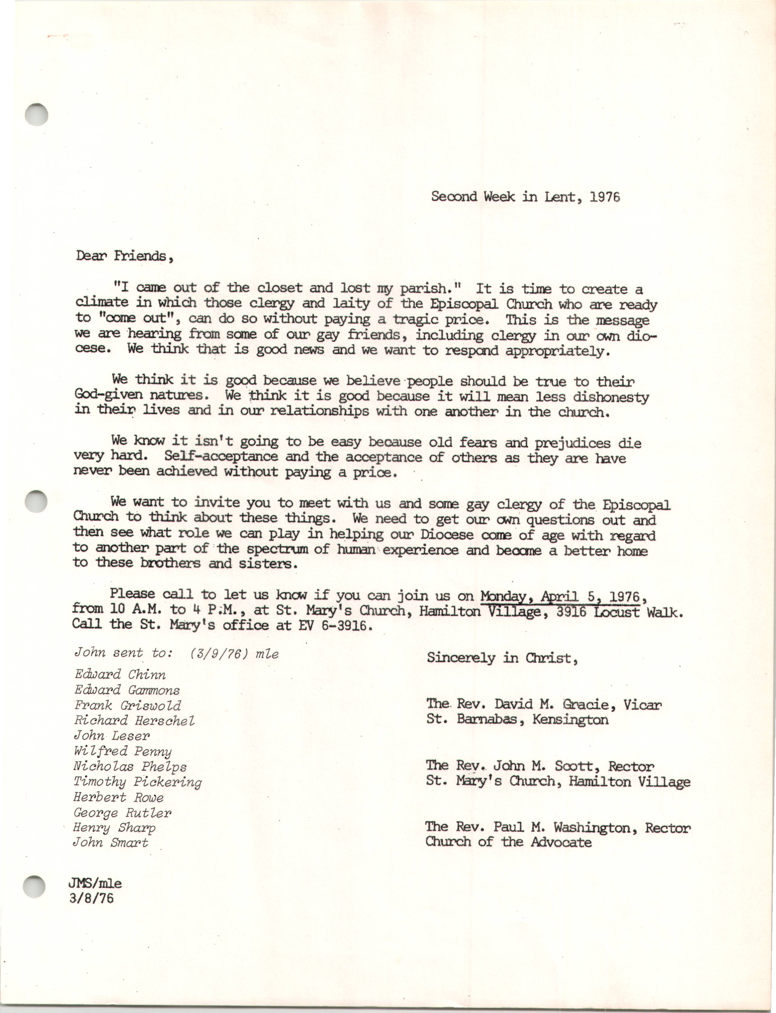 Invitation to a Meeting about Pastoral Issues around LGBT Parishioners and Clergy at St. Mary’s Church, Hamilton Village (1976)