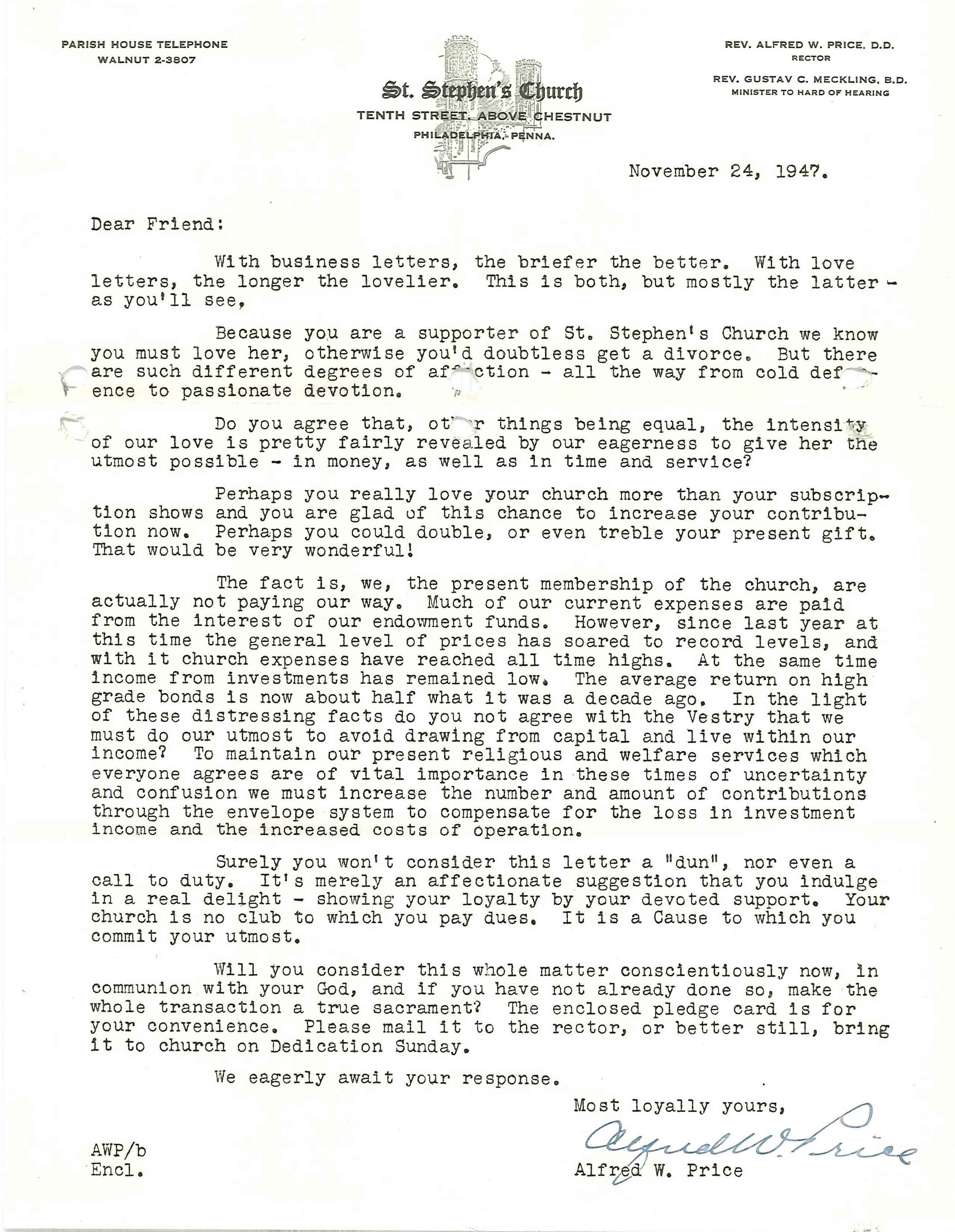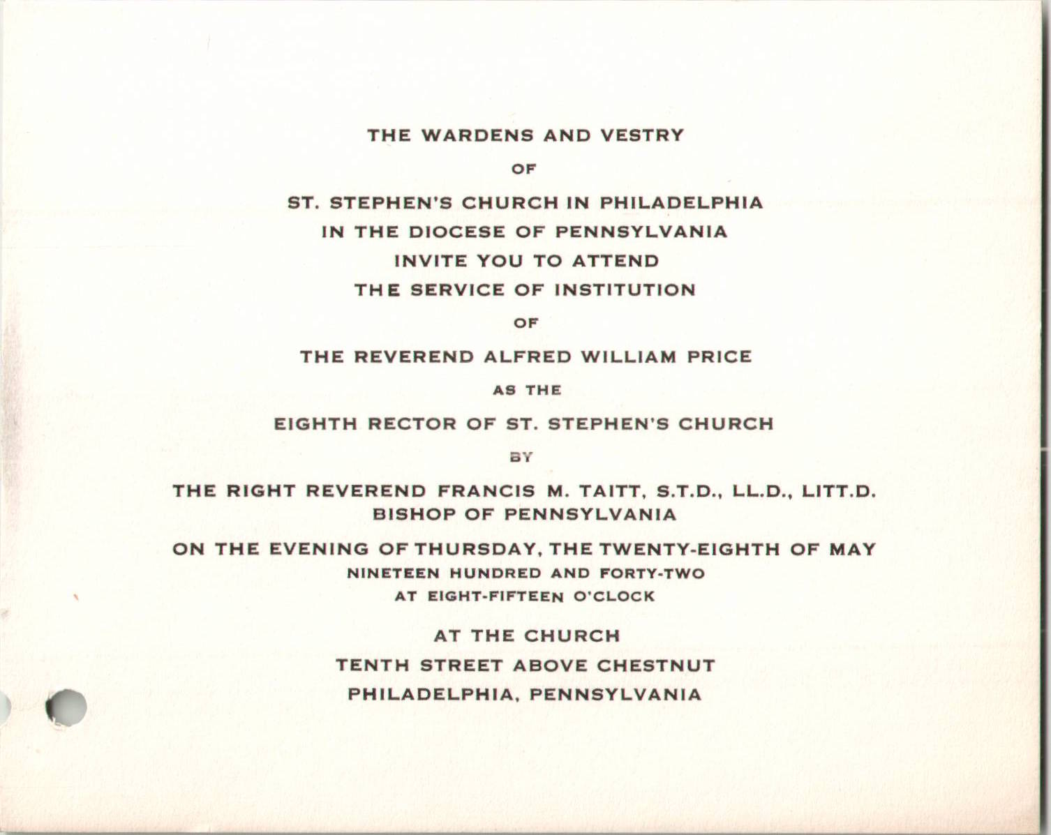 Invitation to the Institution of Rev. Alfred W. Price as the Eighth Rector of St. Stephen’s Church, Philadelphia (1942)