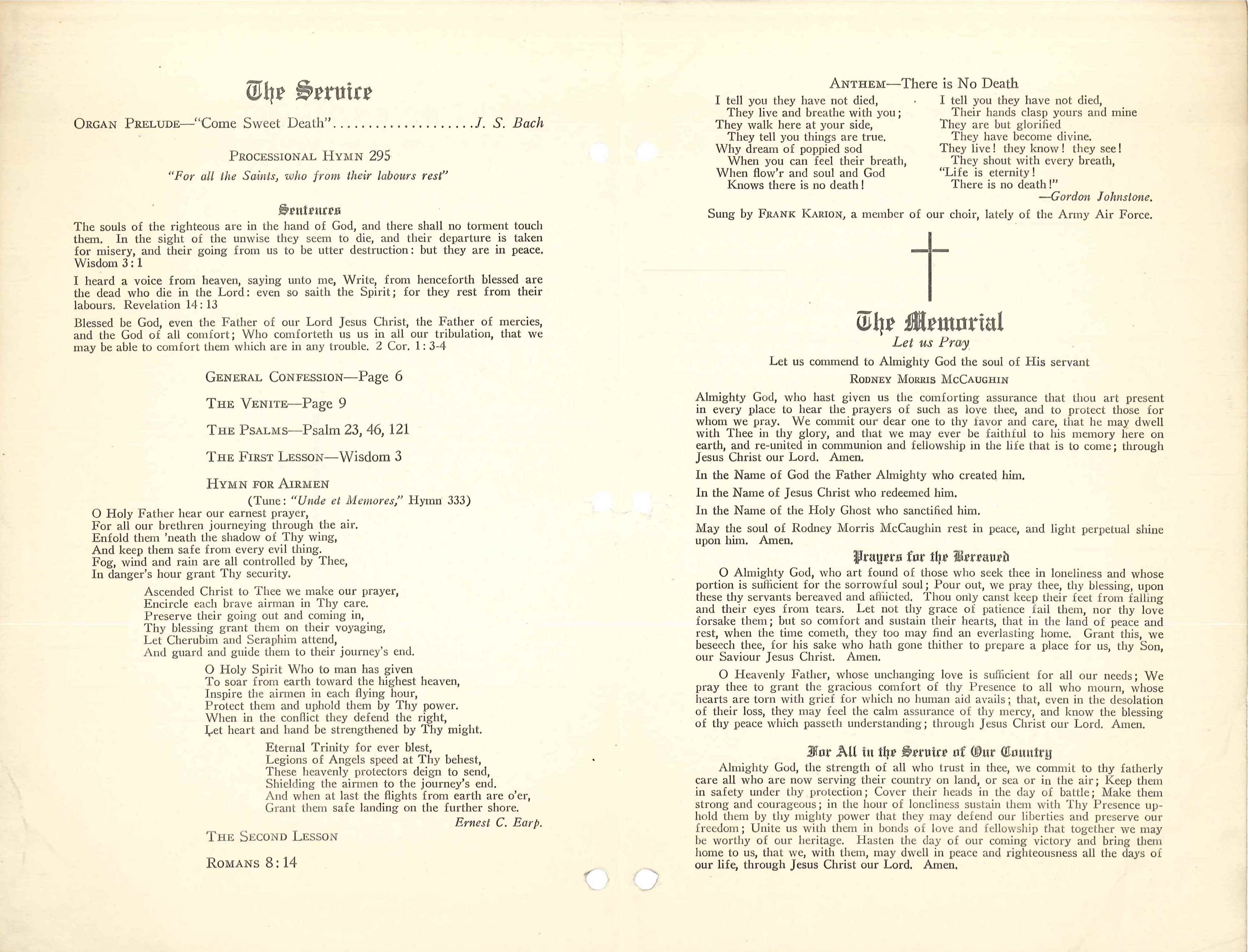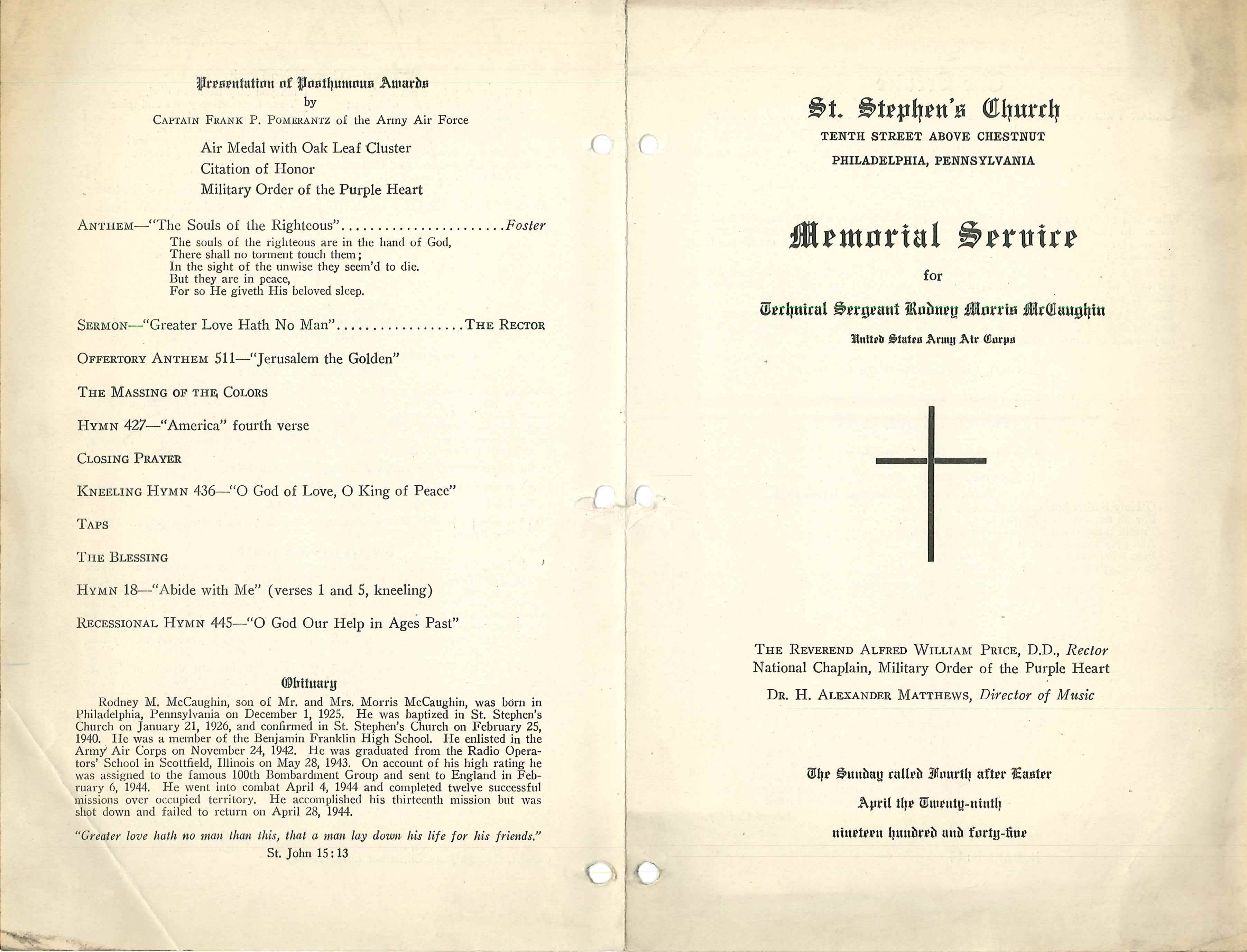 Leaflet from the Memorial Service for Technical Sergeant Rodney Morris McLaughlin at St. Stephen’s Church, Philadelphia (1945)