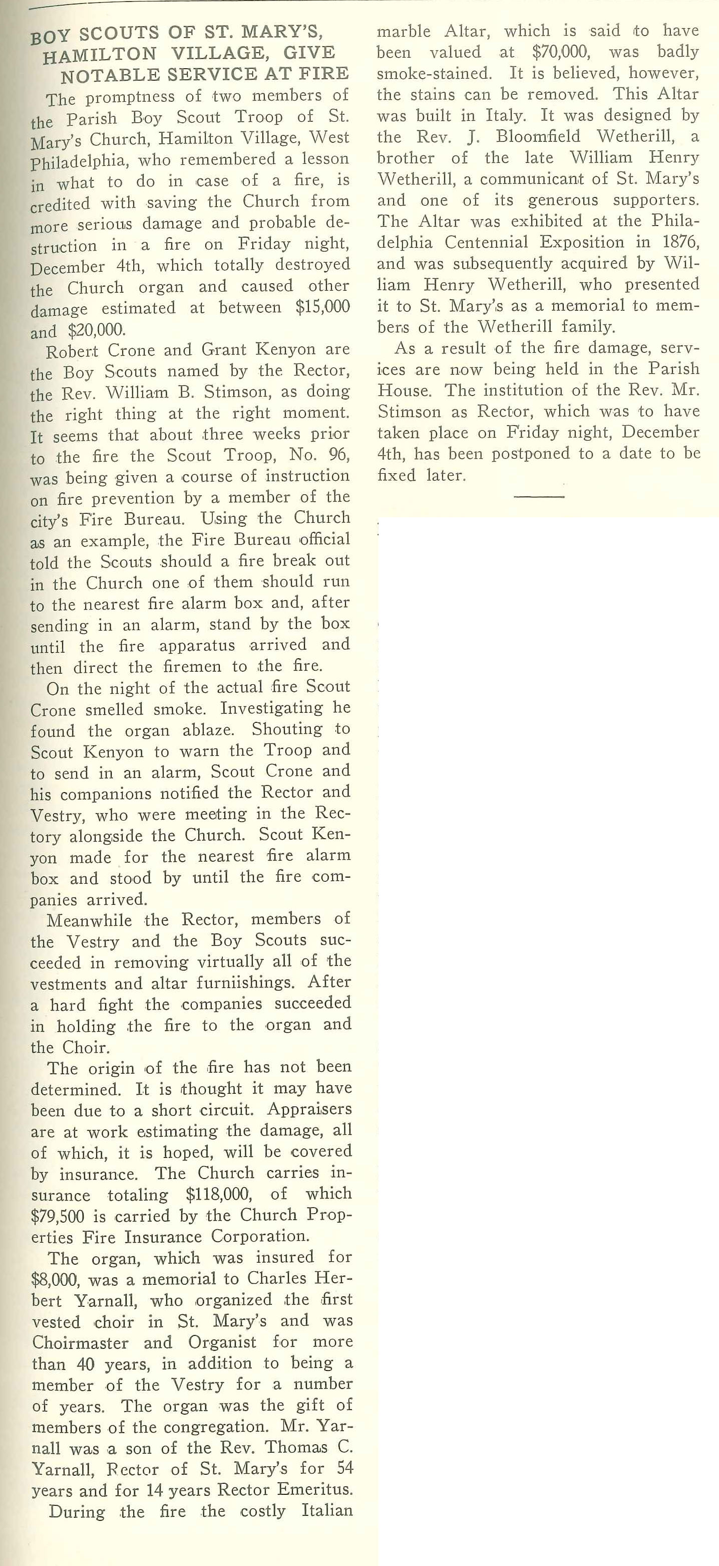 Boy Scout Troop 96 Saves St. Mary’s Church, Hamilton Village, From Fire (1937)