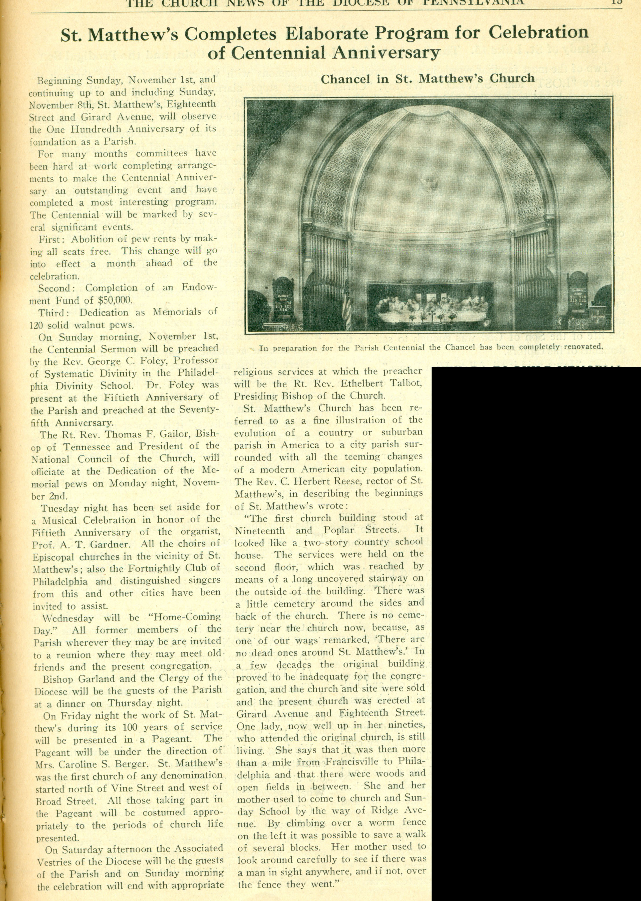 This entry was posted in St. Matthew's Church (Francisville) and tagged C. Herbert Reese, Charles H. Maskell, Church News of the Diocese of Pennsylvania, Francisville, North Philadelphia, Rassman and Donnelly on August 26, 2014 by mjk38.