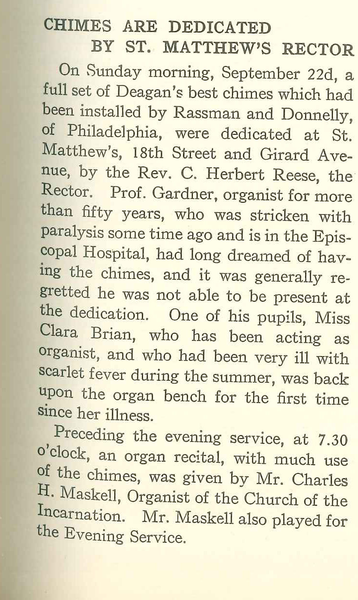 Chimes Dedicated at St. Matthew’s Church, Francisville (1929)