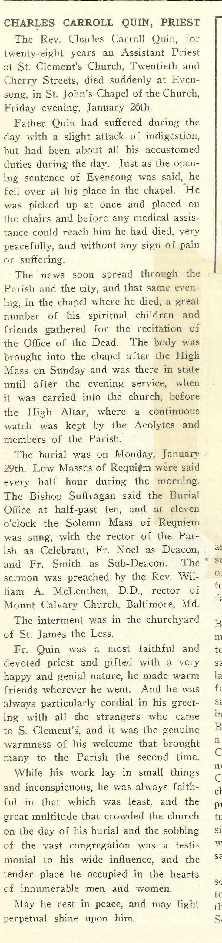 Fr. Quin died during an evensong service [https://atomic-temporary-62150360.wpcomstaging.com/2015/01/15/rev-charles-c-quin-dies-during-evensong-at-st-clements-church-1923/]