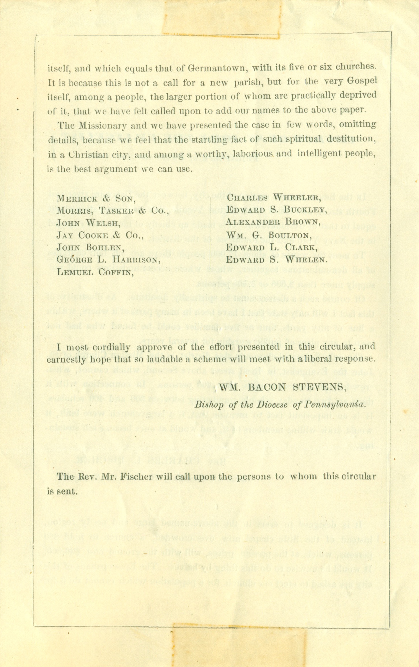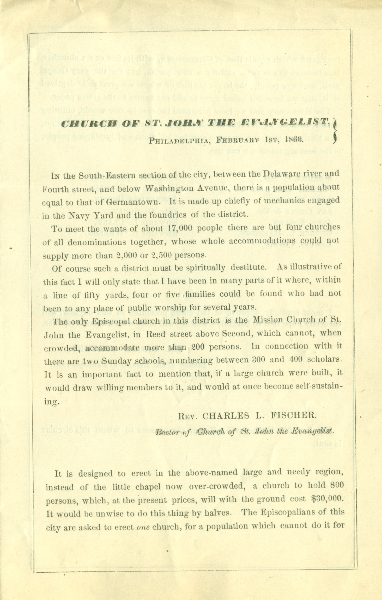 Founds Sought for a New Edifice of Church of St. John the Evangelist, 3rd and Reed (1866)