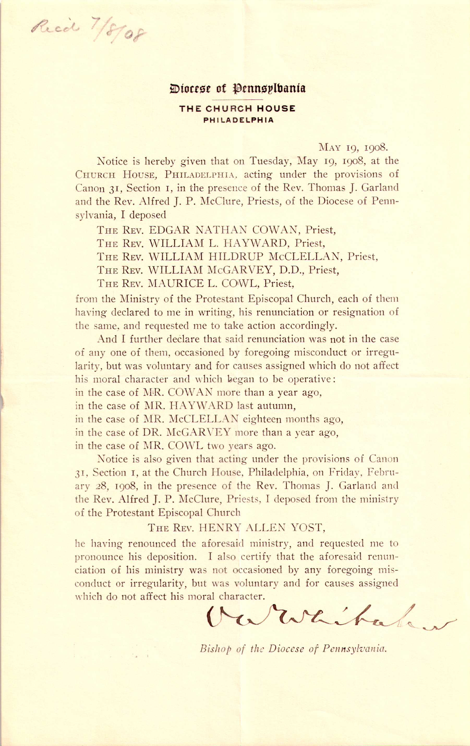 Notice of Priests Deposed by the Bishop of Pennsylvania in 1908