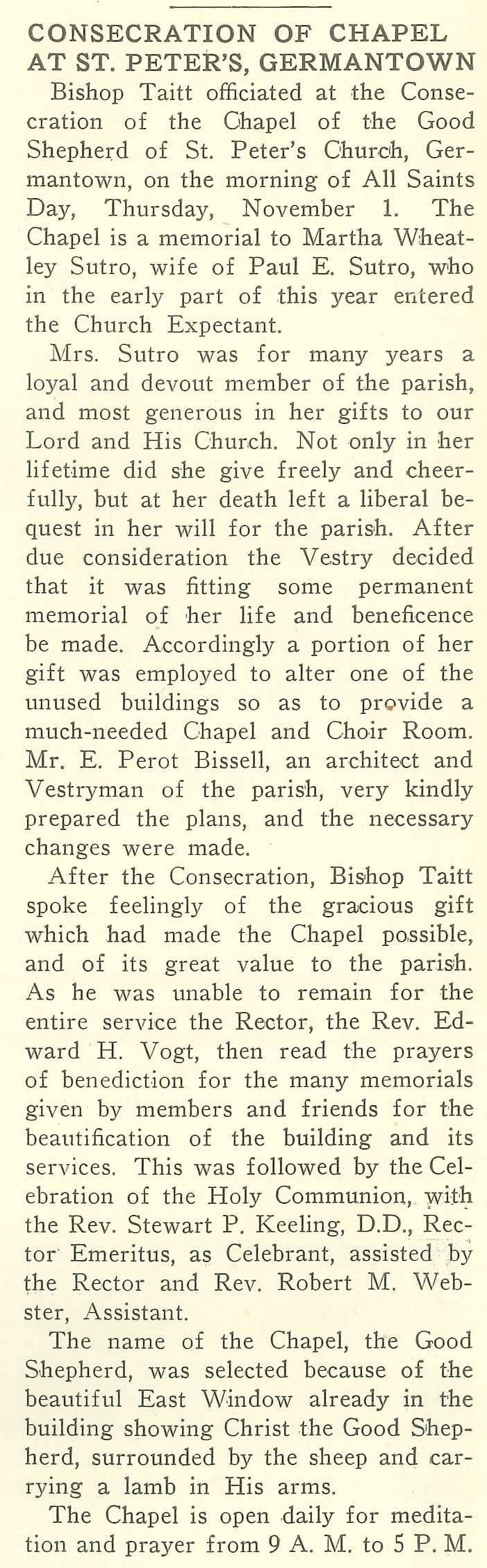 Chapel of the Good Shepherd at St. Peter’s Church, Germantown, Dedicated (1934)
