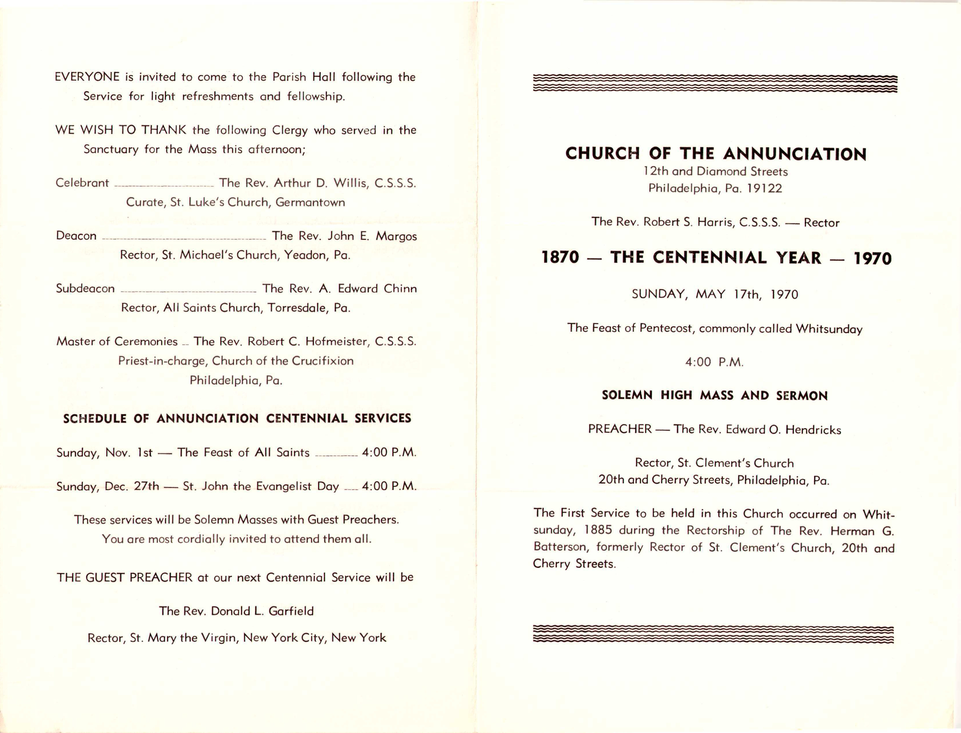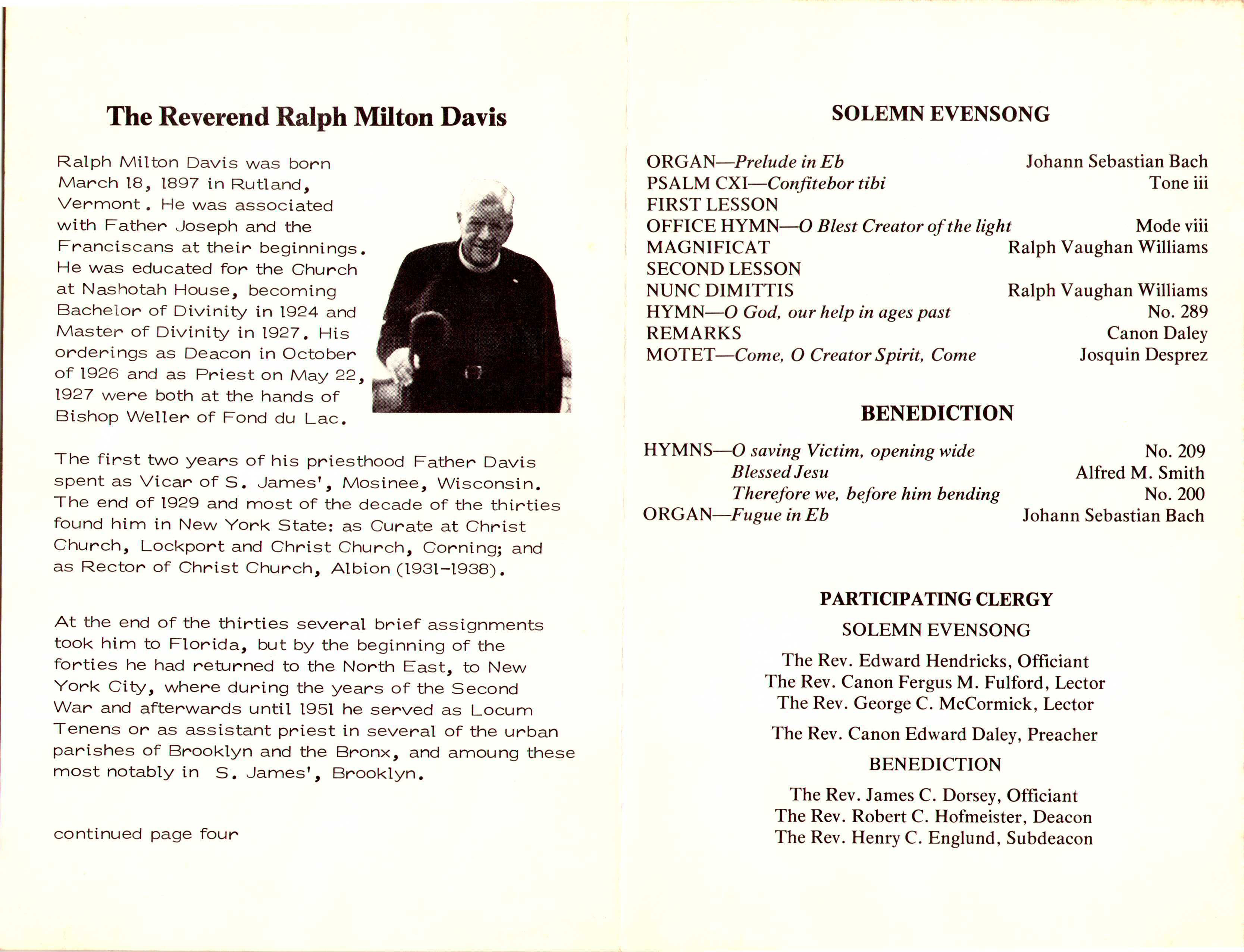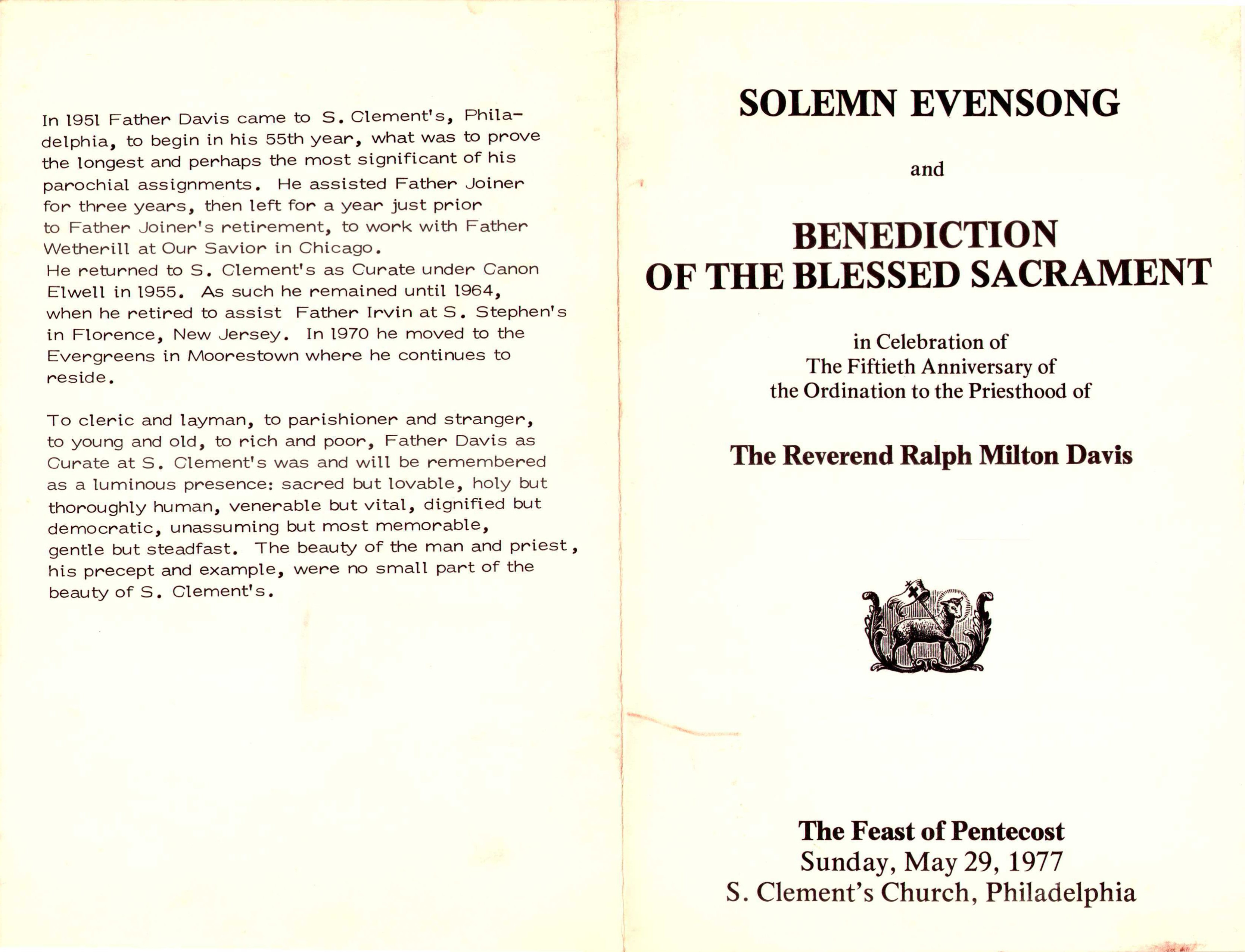 Service Leaflet for the Solemn Evensong and Benediction of the Blessed Sacrament in Celebration of the 50th Anniversary of the Ordination to the Priesthood of Rev. Ralph M. Davis at St. Clement’s Church (1977)